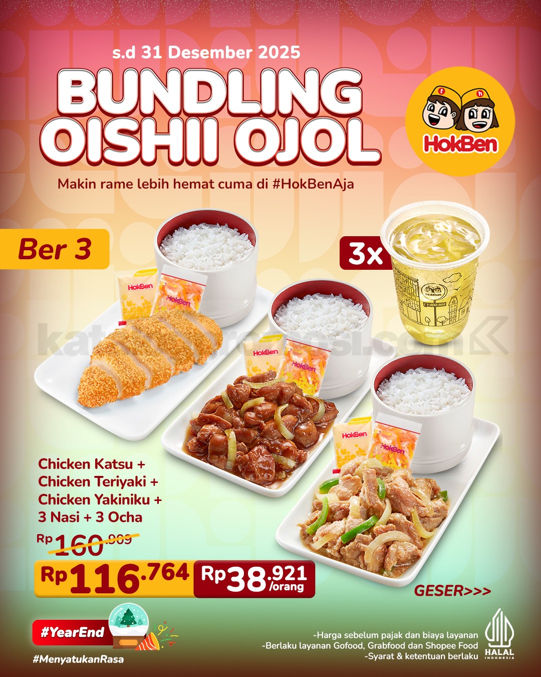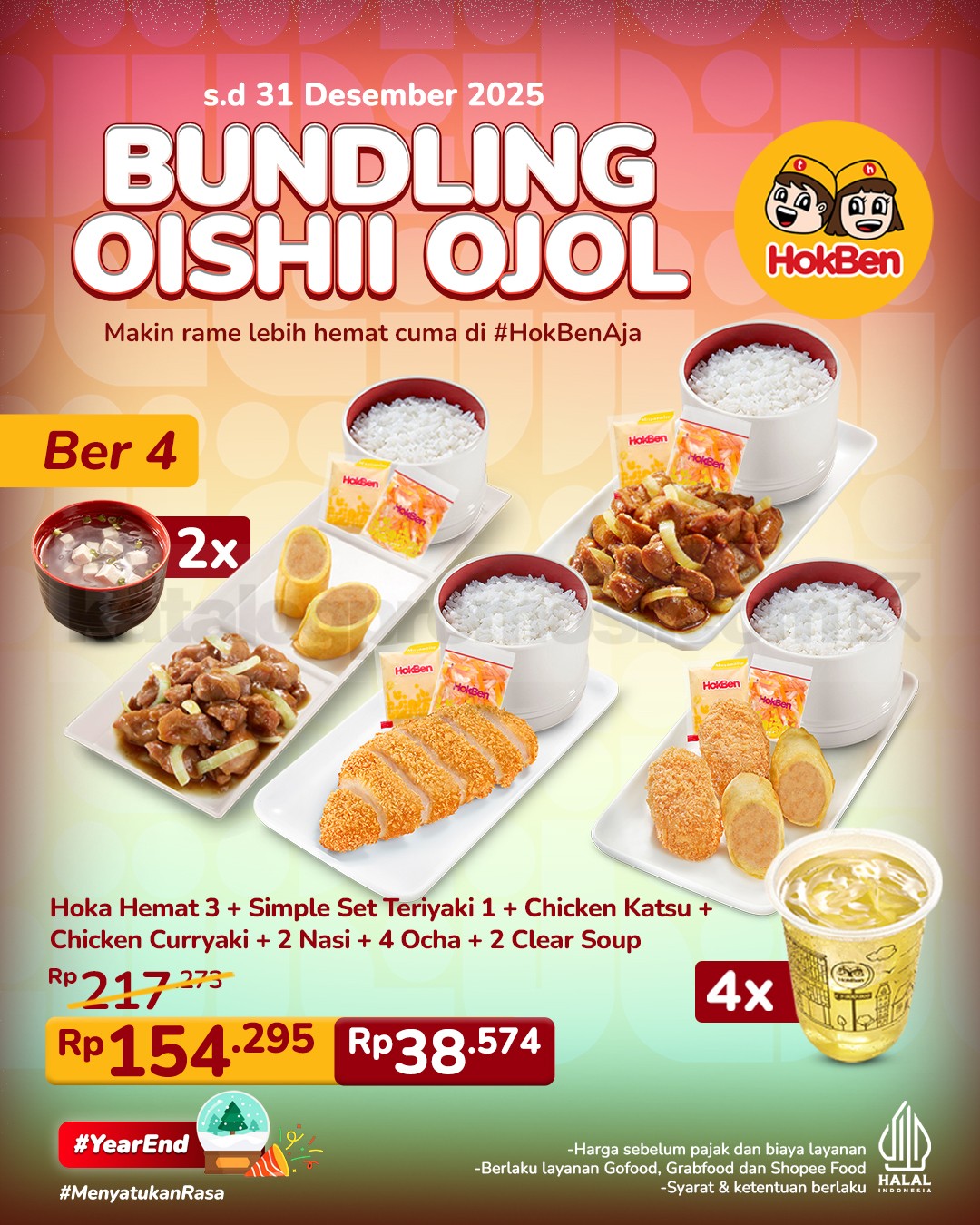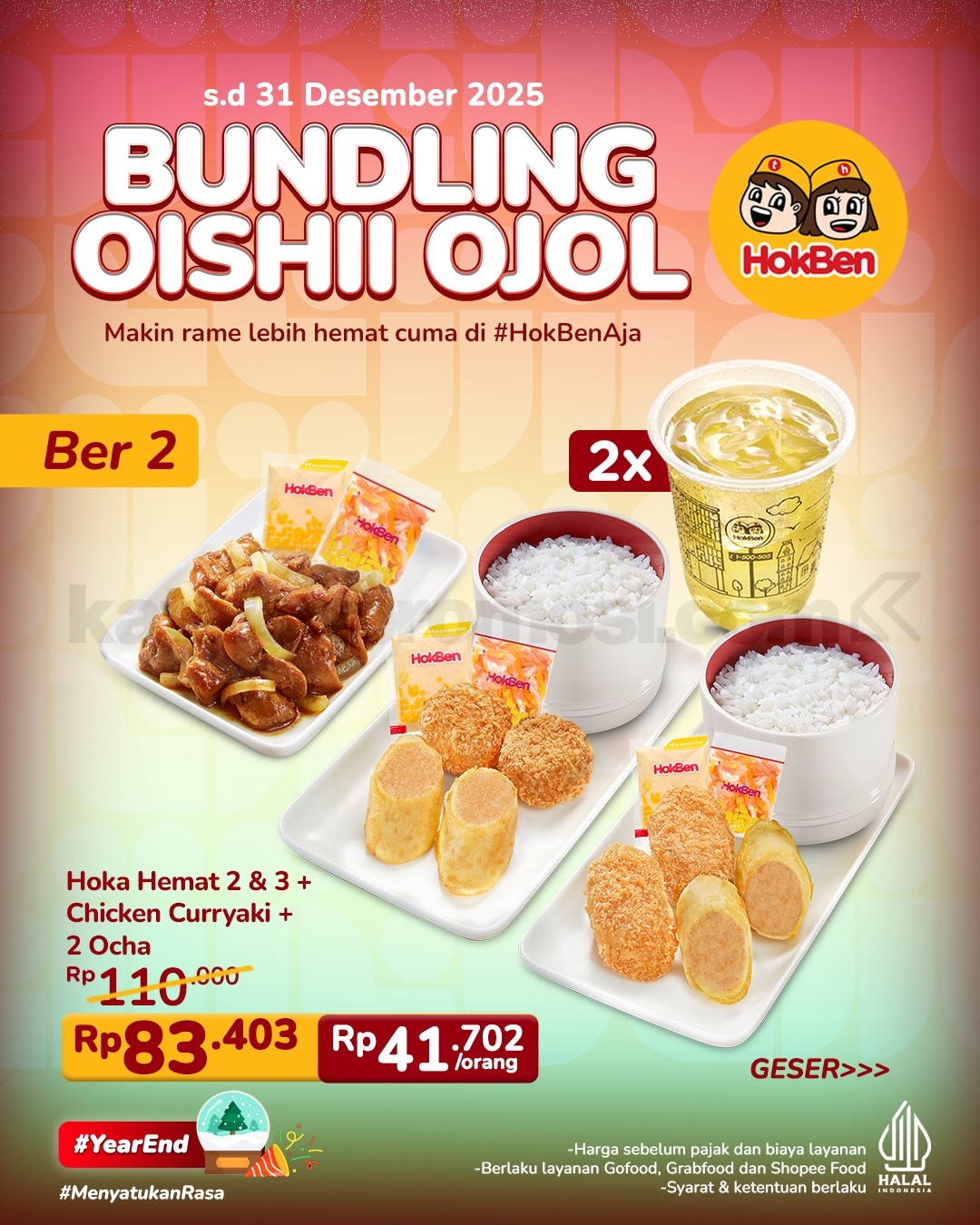 Promo HokBen Bundling Oishii Ojol mulai Rp. 38.574 per orang, nikmati menu lengkap untuk 2-4 orang via GoFood, GrabFood & ShopeeFood, berlaku sampai 31 Desember 2025.