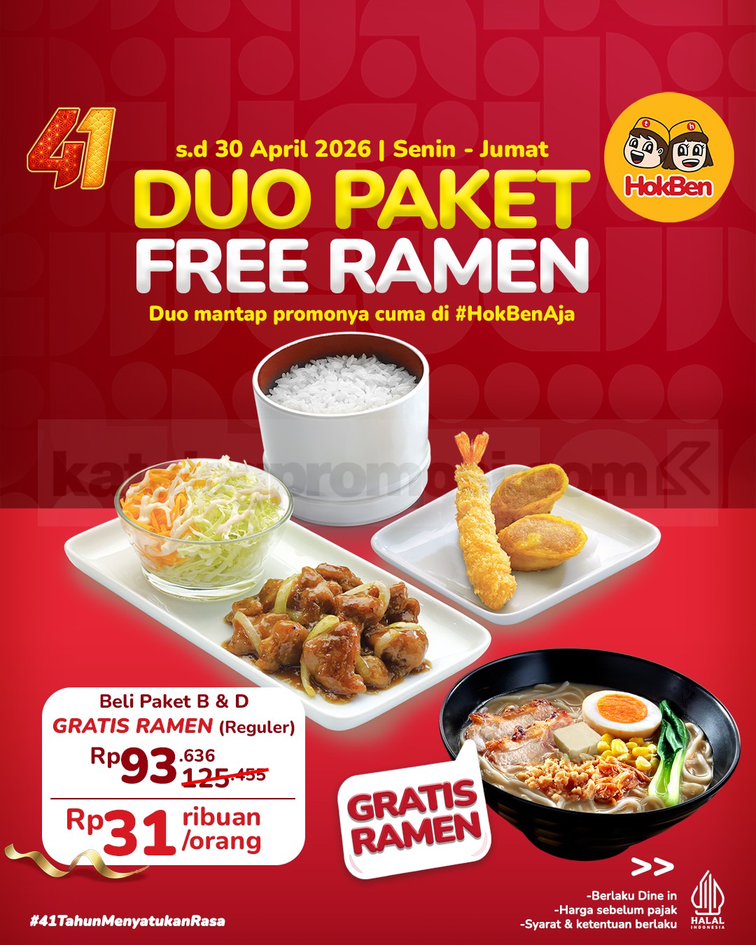 Promo HokBen Duo Paket Free Ramen Mulai Rp. 31 ribuan ini berlaku sampai 30 April 2026 setiap hari Senin sampai Jumat, jadi pastikan kamu nggak melewatkan momen makan hemat dengan bonus yang mengenyangkan đŸ˜‹