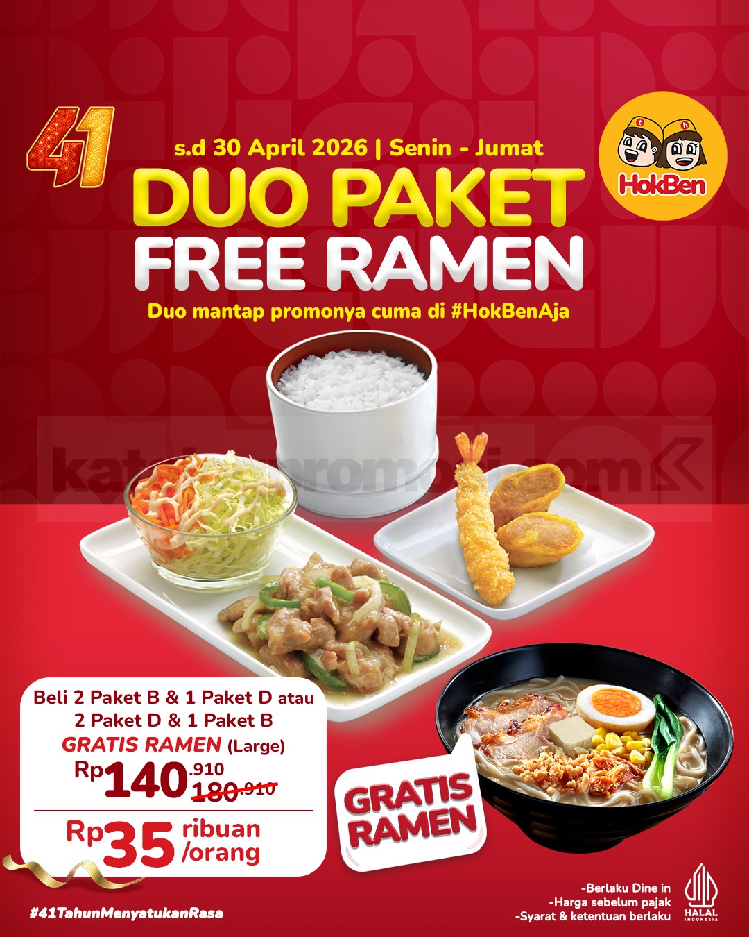 Promo HokBen Duo Paket Free Ramen Mulai Rp. 31 ribuan/orang buy 2 free 1 dan buy 3 free 1 berlaku hingga tanggal 30 April 2026 di seluruh outlet.