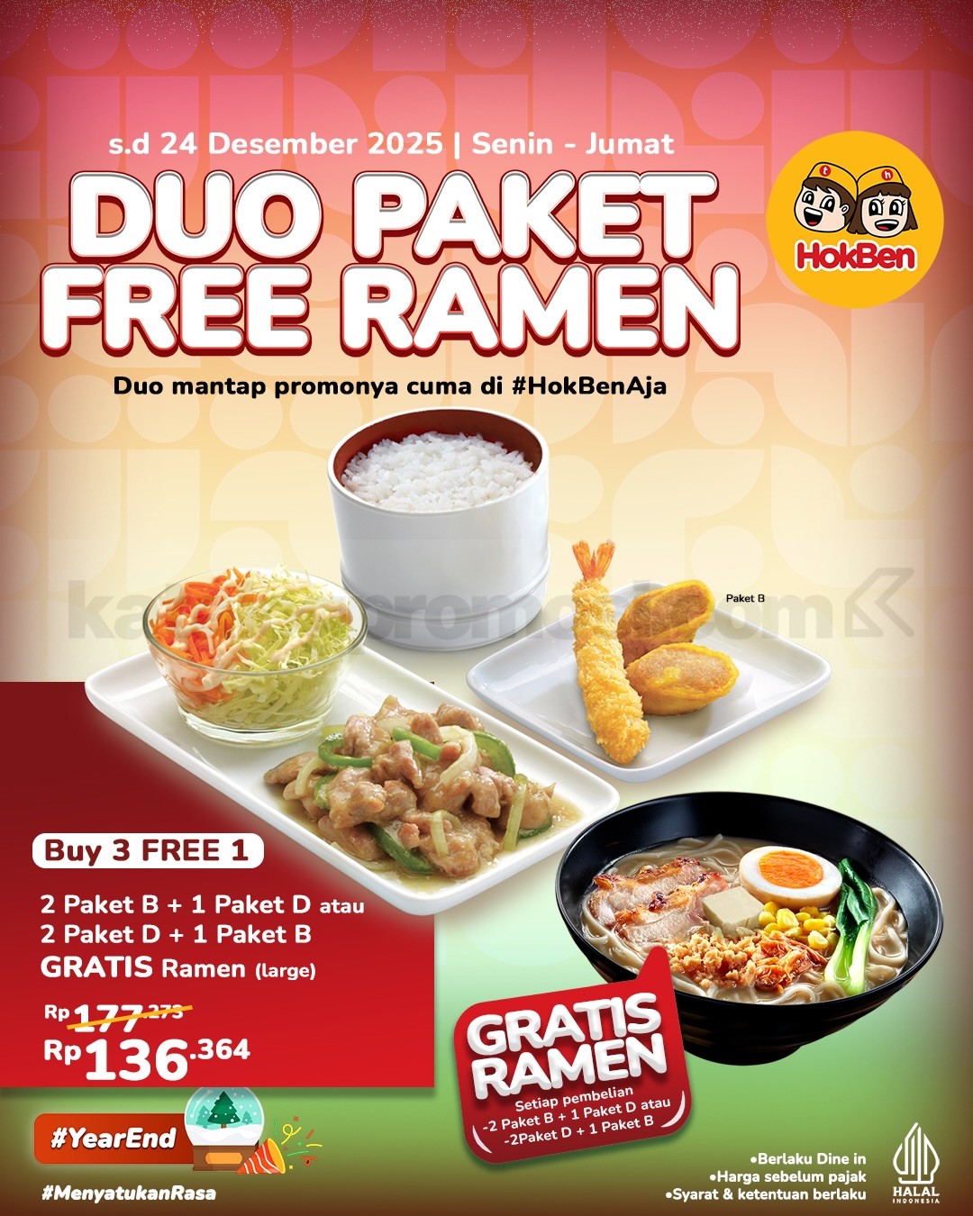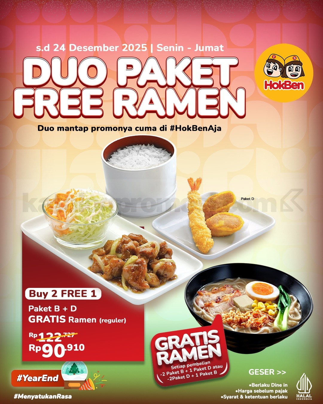 Promo HokBen Duo Paket Free Ramen Mulai Rp. 90.910, nikmati Buy 2 FREE 1 & Buy 3 FREE 1 + Ramen gratis berlaku s.d 24 Desember 2025 di seluruh outlet