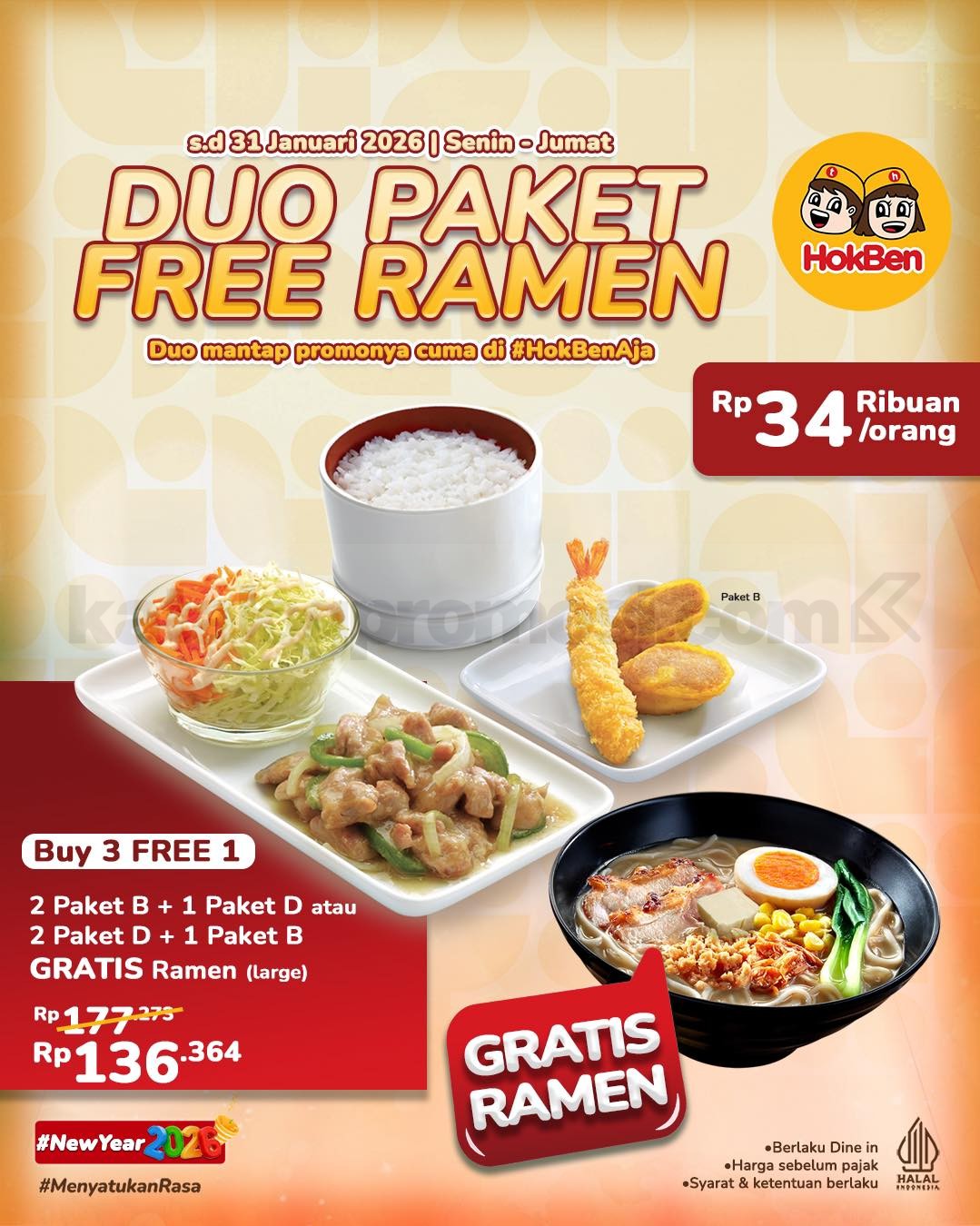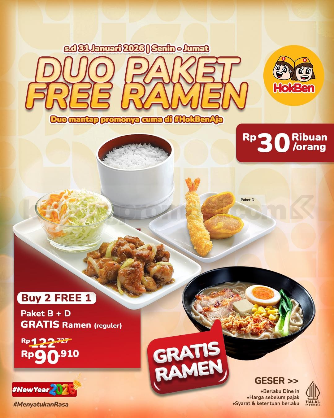Promo HokBen Duo Paket Free Ramen mulai Rp. 30.000 dengan mekanisme beli paket pilihan gratis ramen, berlaku mulai tanggal 1 Januari 2026 – 31 Januari 2026 di seluruh outlet.