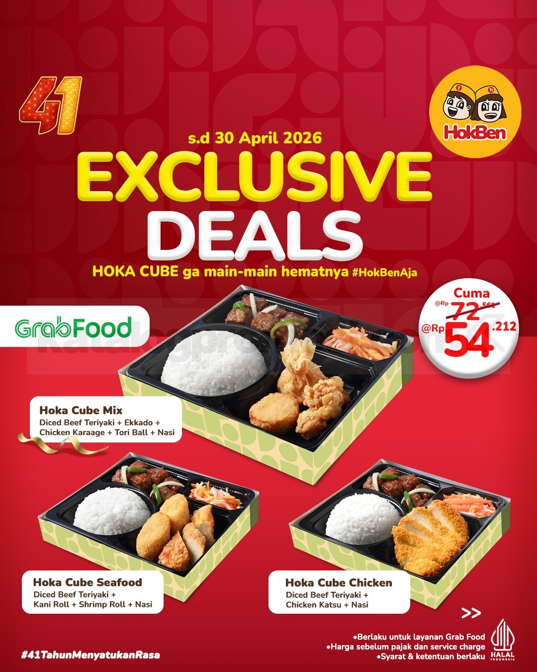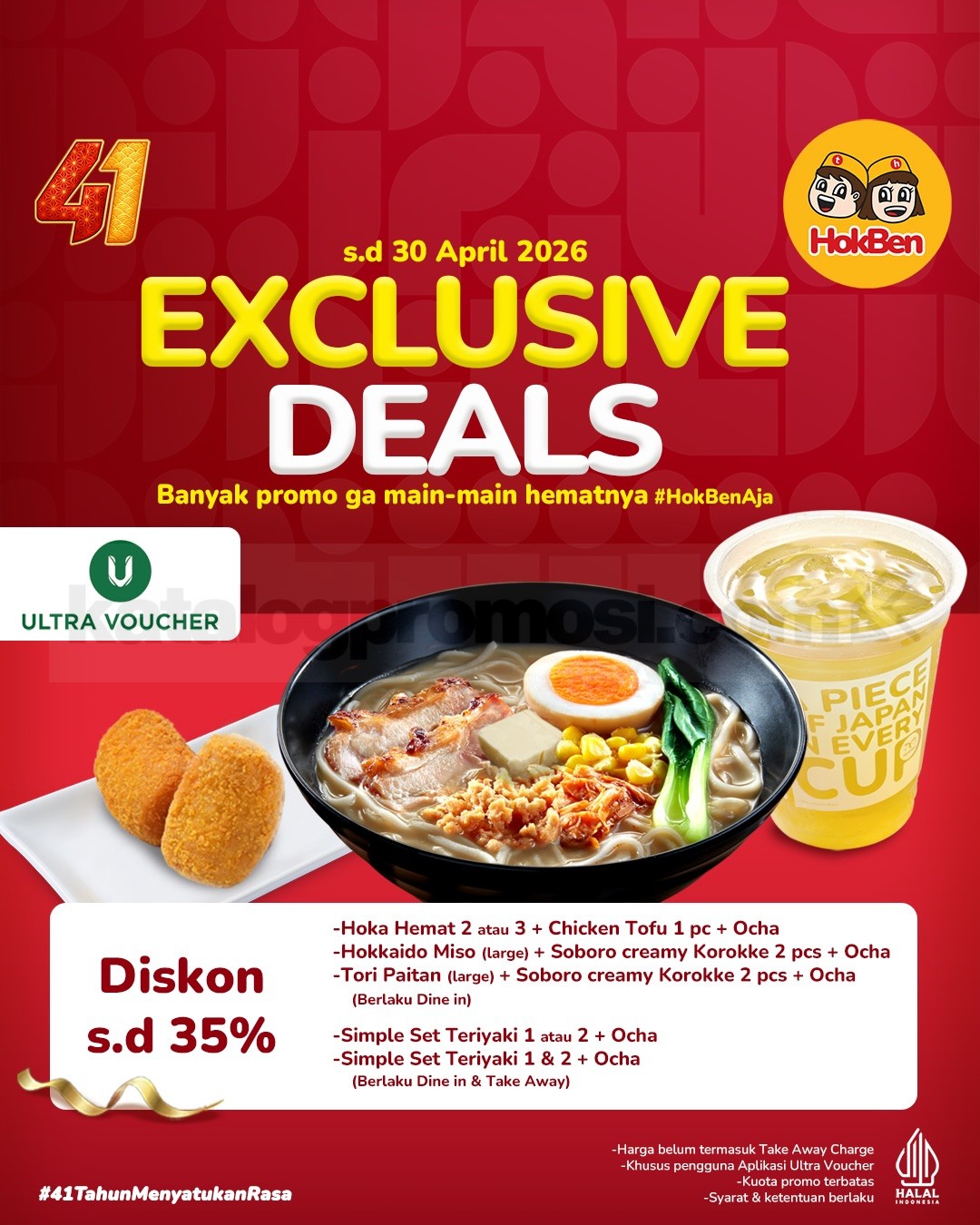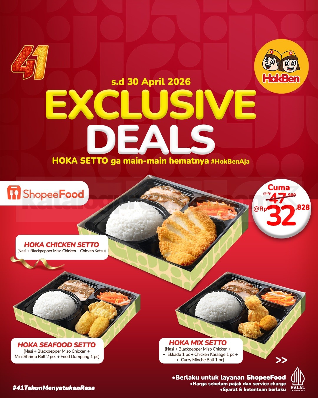Promo HokBen Exclusive Deals diskon hingga 35% dan harga mulai Rp. 32.828 dengan berbagai partner pembayaran berlaku mulai tanggal 1 April 2026 – 30 April 2026.