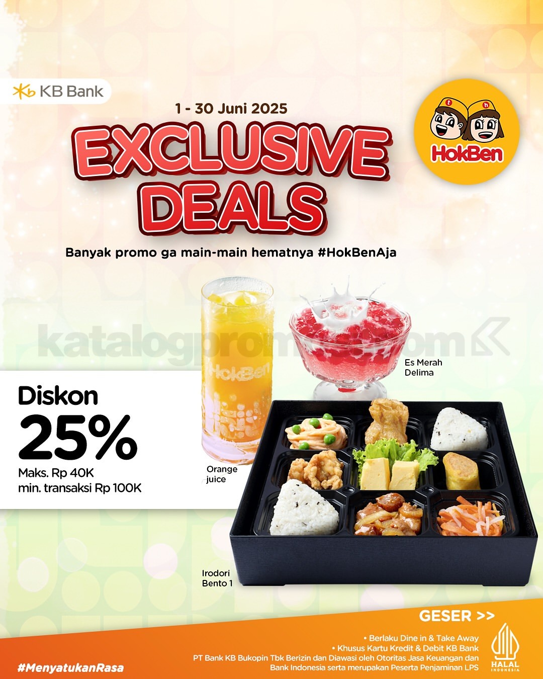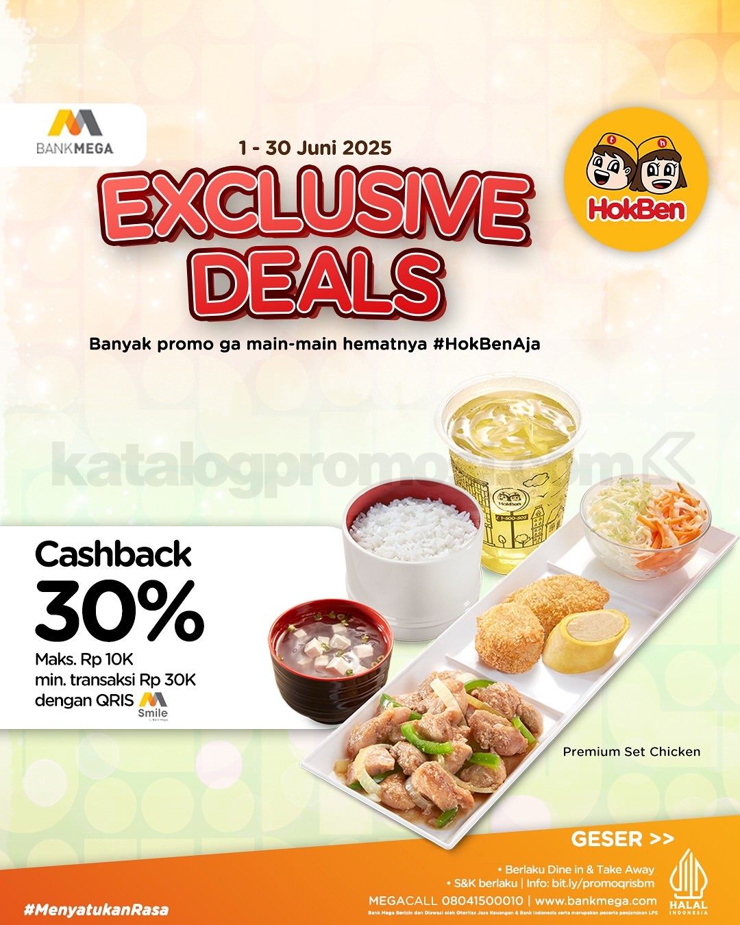 Nikmati promo spesial selama Juni 2025 bareng HokBen! 🎉 Mulai dari cashback, diskon gede, hingga menu cuma Rp1 bisa kamu dapatkan lewat metode pembayaran pilihan dari bank, e-wallet, hingga layanan online order partner! 🤩