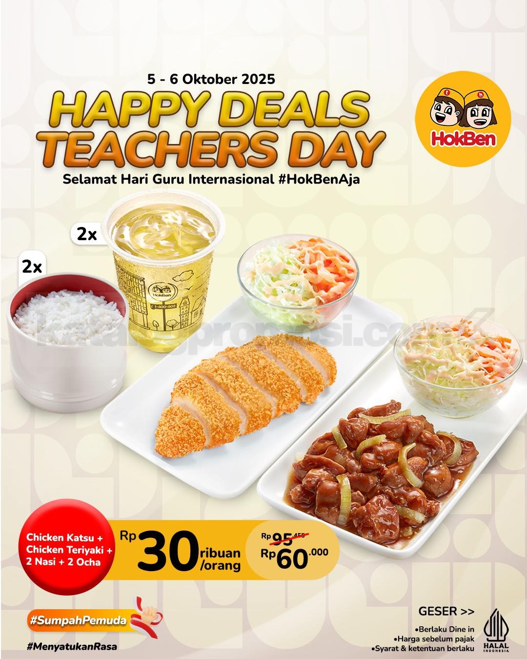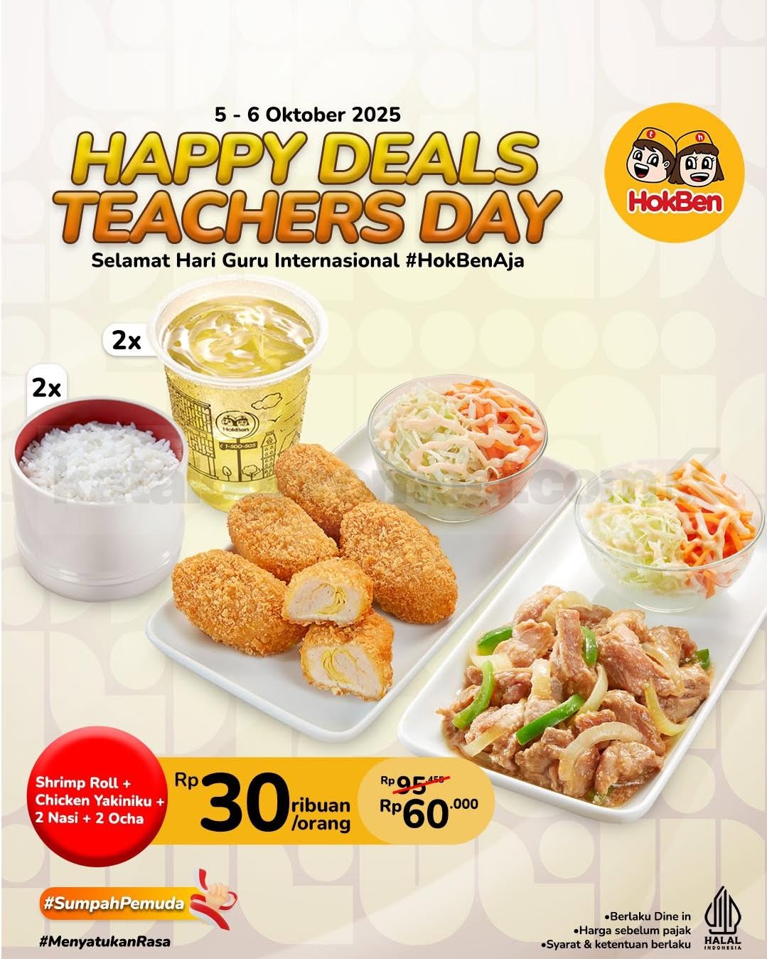 Promo HokBen Happy Deals Teachers Day cuma Rp30 ribuan sudah termasuk 2 menu hemat lengkap dengan nasi & ocha, berlaku 5โ6 Oktober 2025 untuk layanan dine in di seluruh outlet.