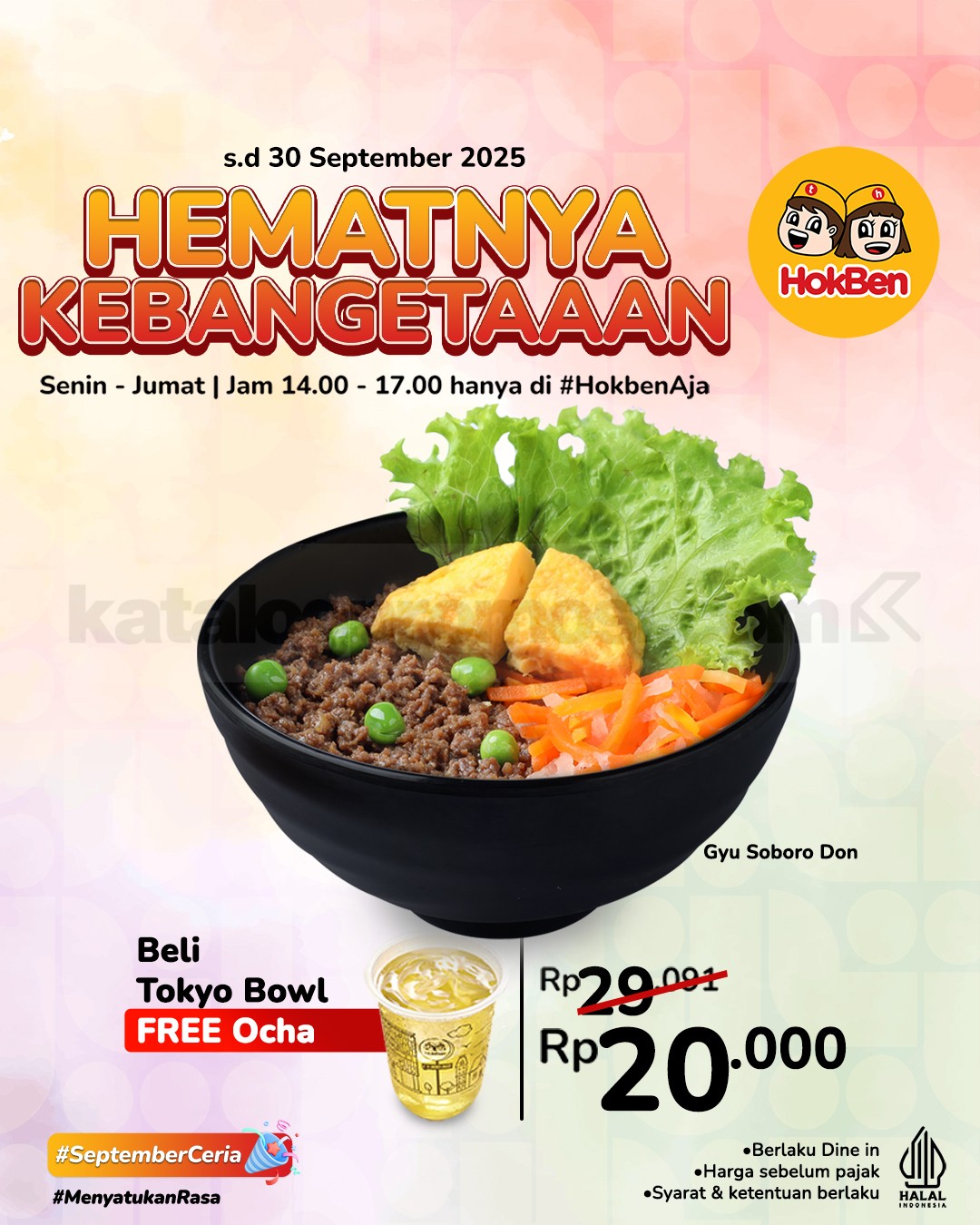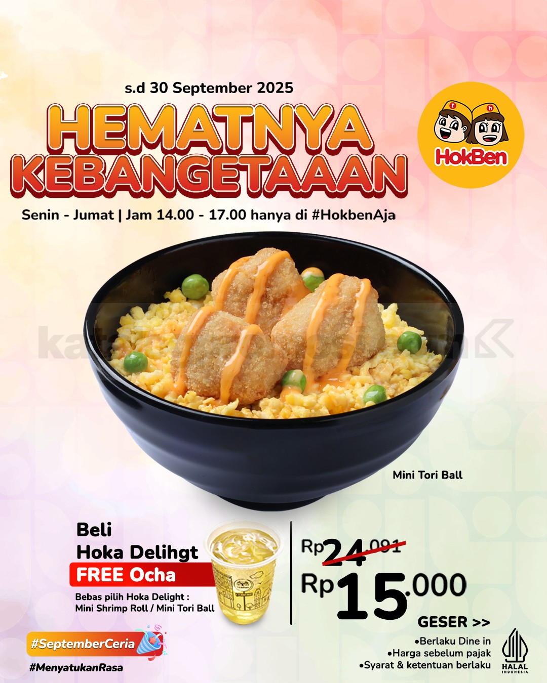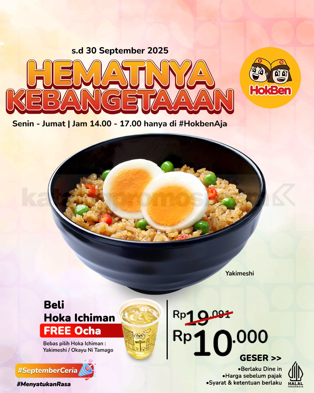 Promo HokBen Happy Hour menu favorit mulai Rp10.000 plus free Cold Ocha berlaku mulai tanggal 1 – 30 September 2025 di seluruh outlet dine in.