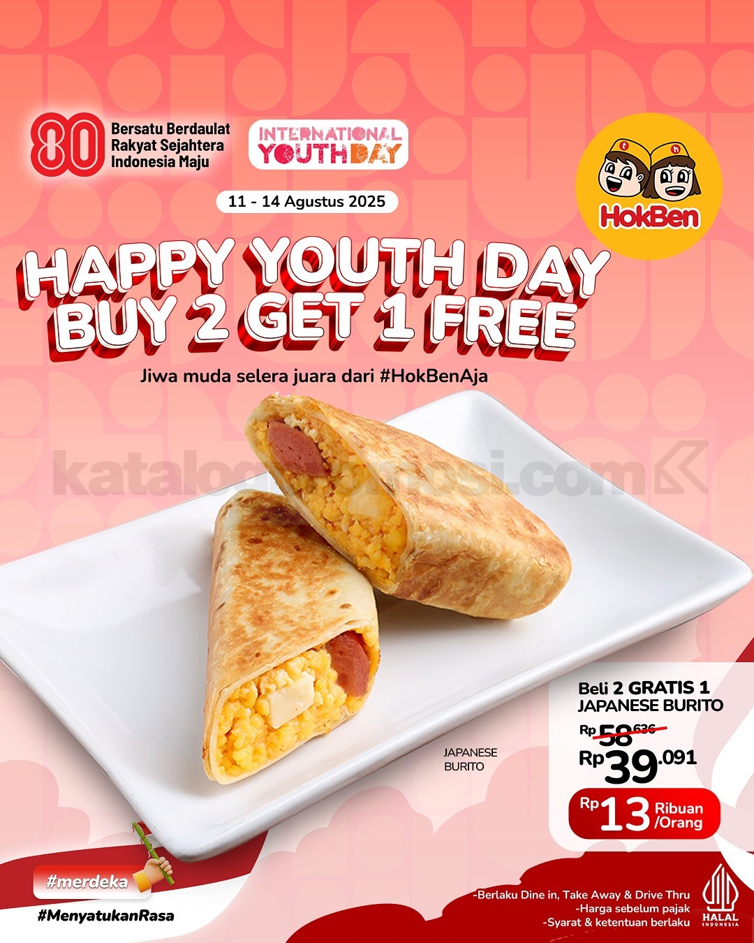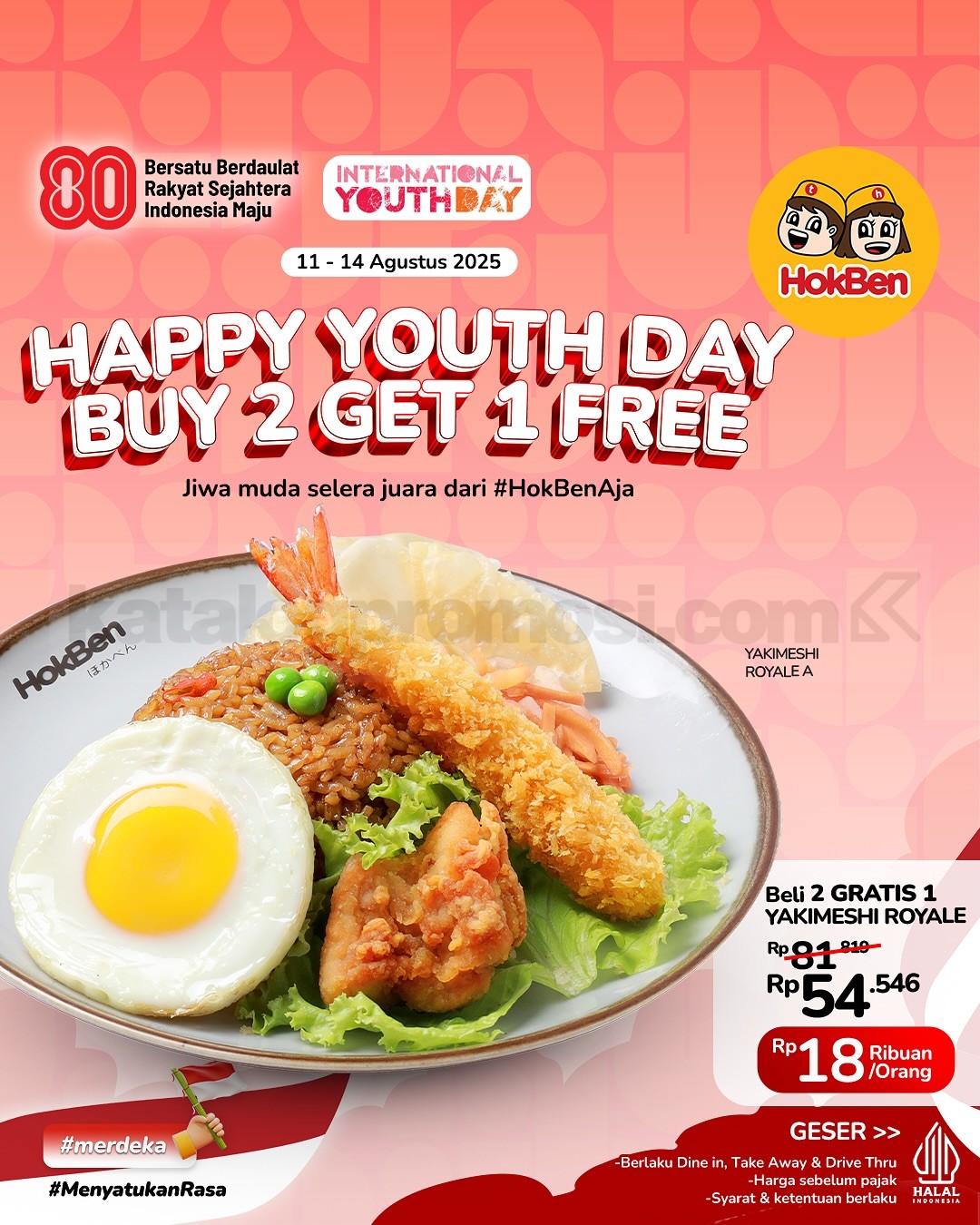Promo HokBen Happy International Youth Day beli 2 gratis 1 berlaku mulai tanggal 11โ14 Agustus 2025 untuk menu Yakimeshi Royale dan Japanese Burito.