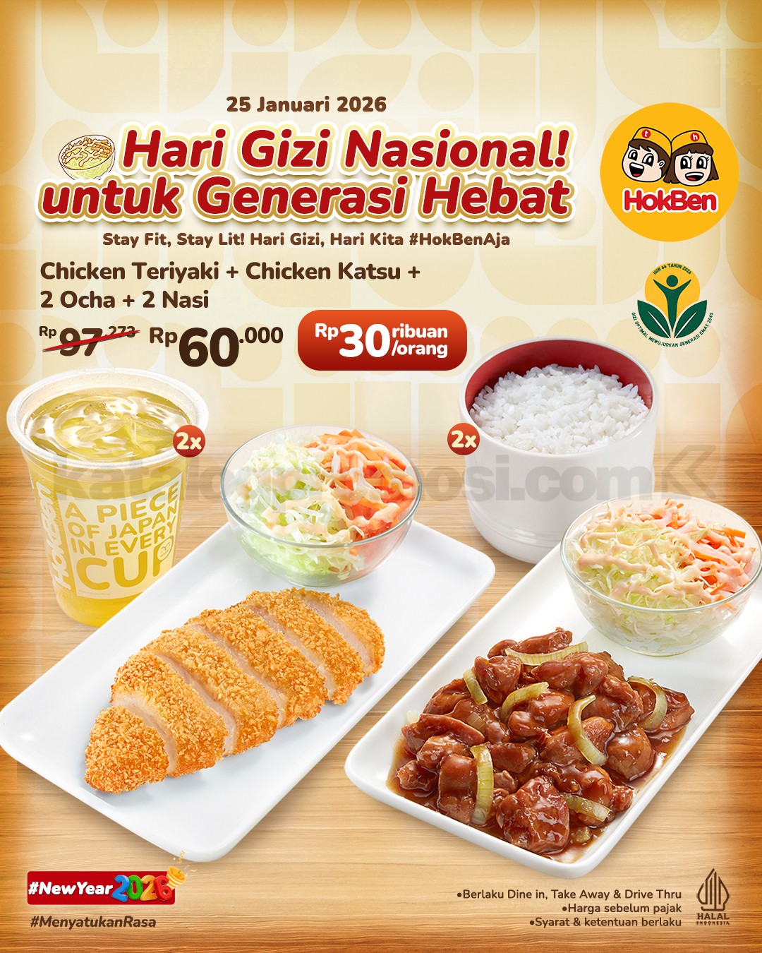 Promo HokBen Hari Gizi Nasional Berdua Rp. 60.000 berlaku hanya di tanggal 25 Januari 2026 dengan paket menu berprotein tinggi di outlet HokBen.