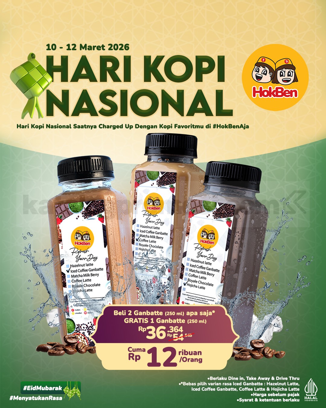Promo HokBen Hari Kopi Nasional Beli 2 Gratis 1 Ganbatte nikmati 3 botol Rp. 36.364 berbagai varian kopi berlaku mulai tanggal 10 Maret 2026 – 12 Maret 2026