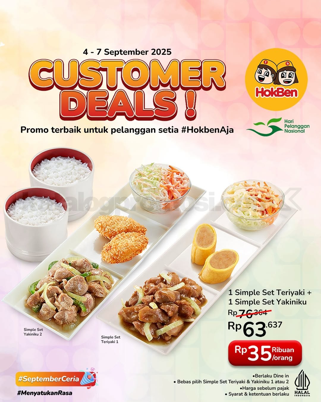 Promo HokBen Hari Pelanggan Nasional hadir 4–7 September 2025! Paket 1 Simple Set Teriyaki + 1 Simple Set Yakiniku cuma Rp35Ribuan/orang.