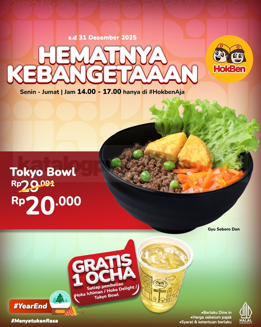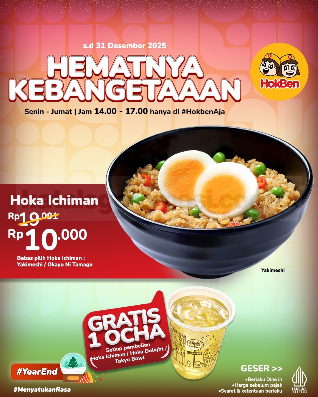 Promo HokBen Hematnya Kebangetan Mulai Rp. 10.000, dapatkan Free Cold Ocha untuk Hoka Ichiman, Hoka Delight & Tokyo Bowl, berlaku SeninโJumat s/d 31 Desember 2025