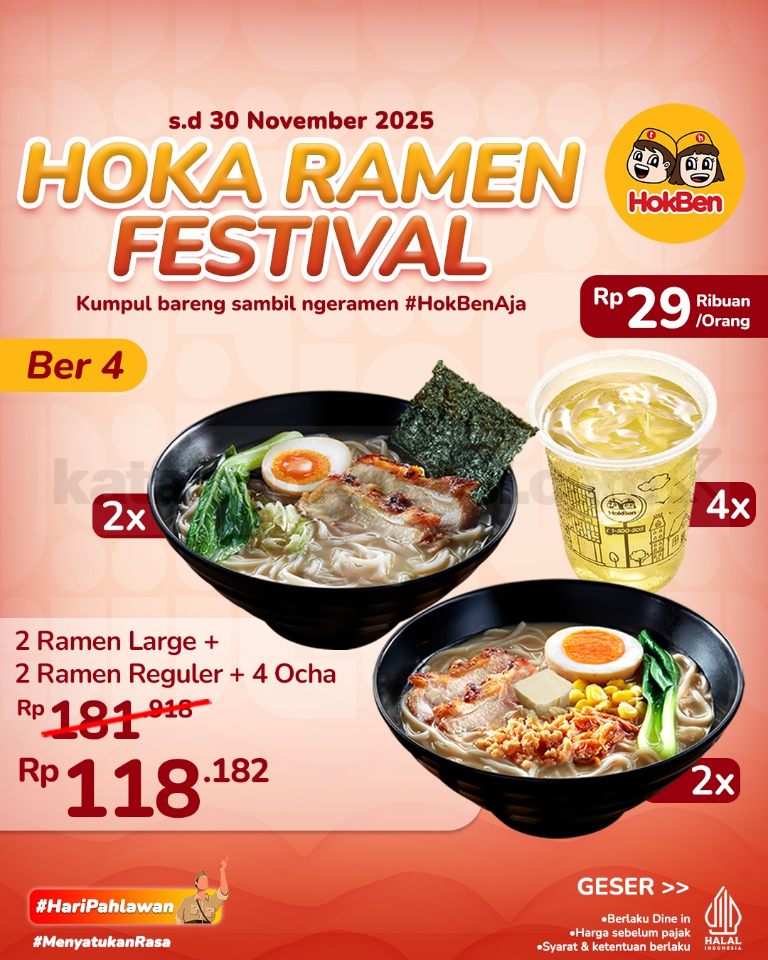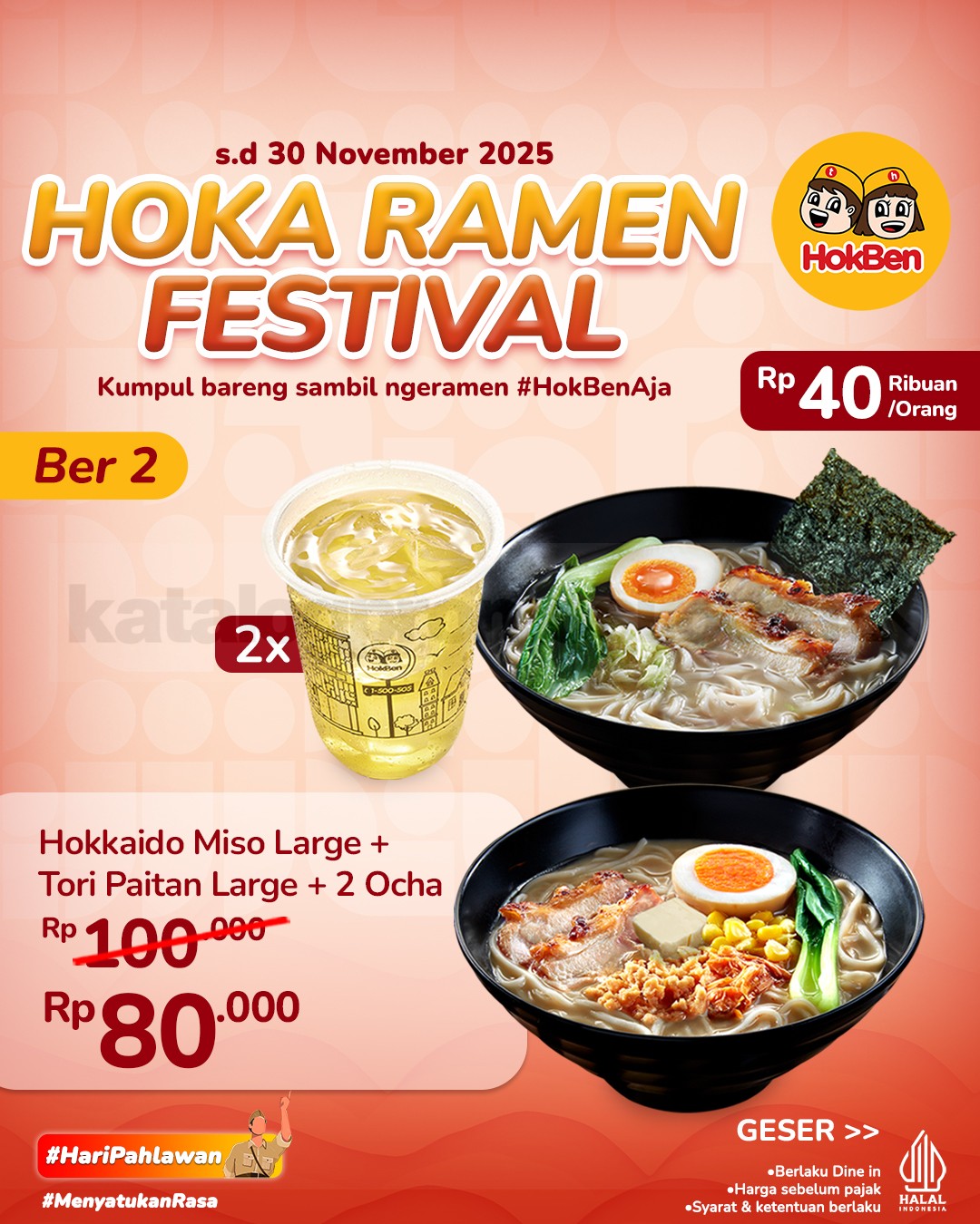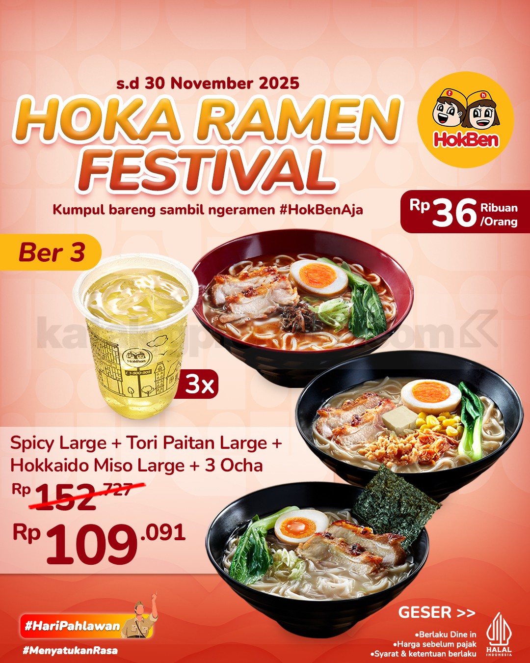 Promo HokBen Hoka Ramen Festival mulai Rp36 ribuan per orang lengkap dengan Cold Ocha, berlaku sampai 30 November 2025 di seluruh outlet dine in.