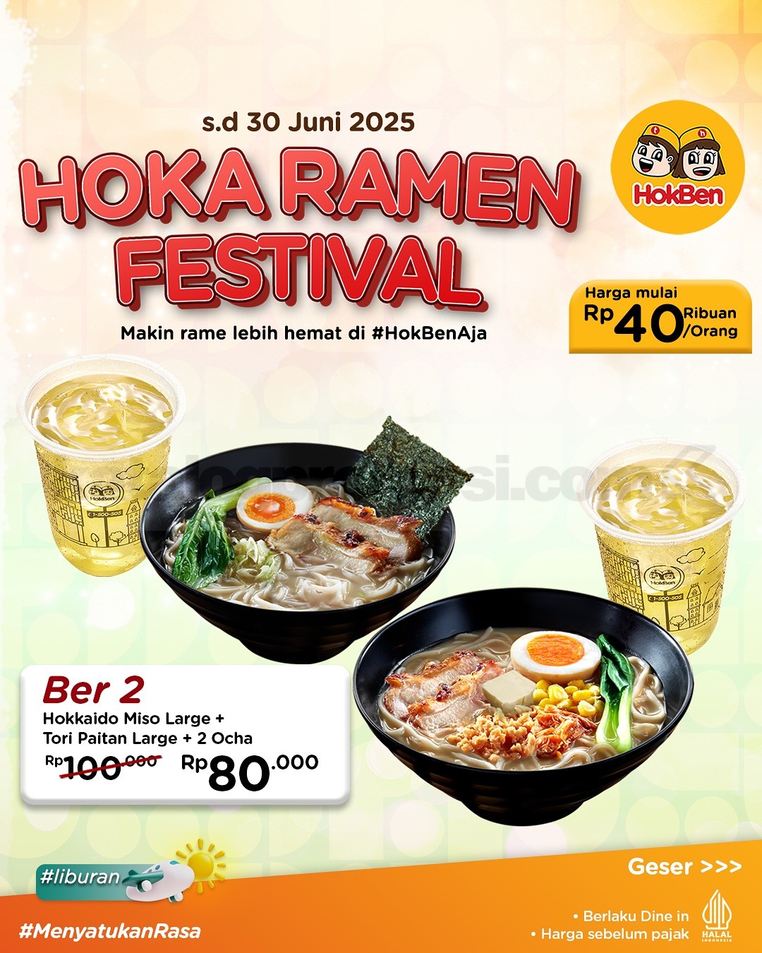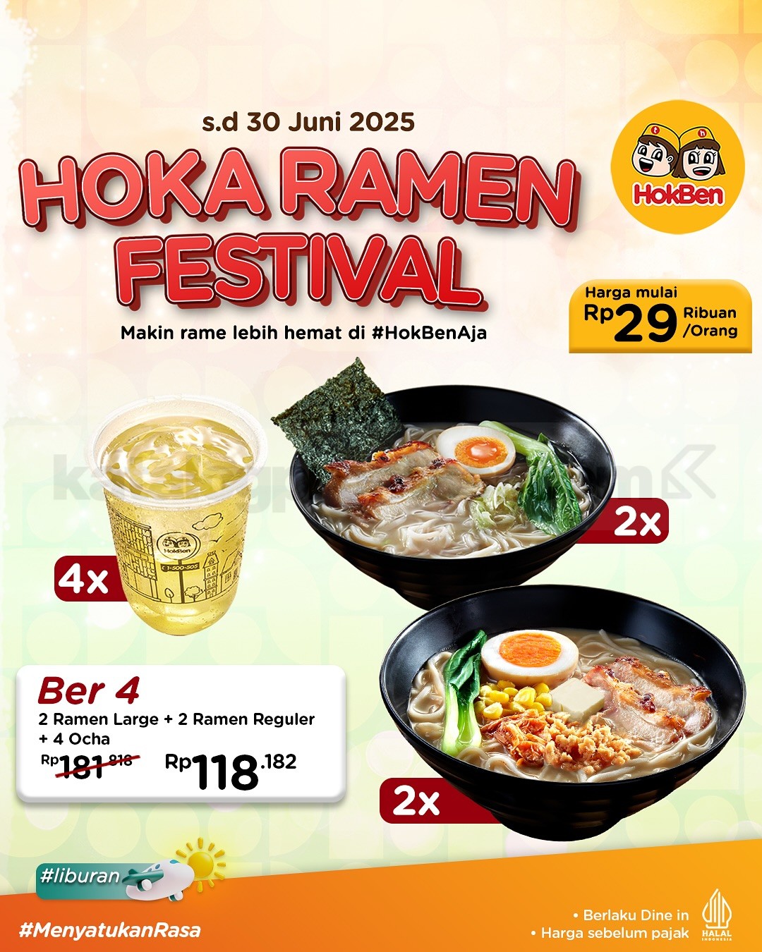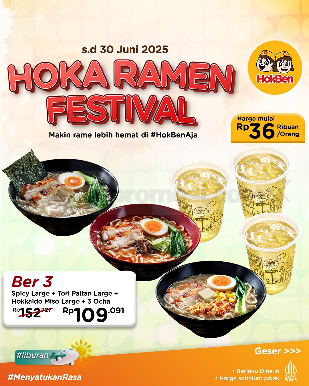 Jangan sampai kelewatan, segera ajak teman, pasangan, atau keluarga buat nyobain promo Hoka Ramen Festival di HokBen. Nikmati ramen hangat plus Ocha segar dengan harga hemat, mumpung masih ada promonya!