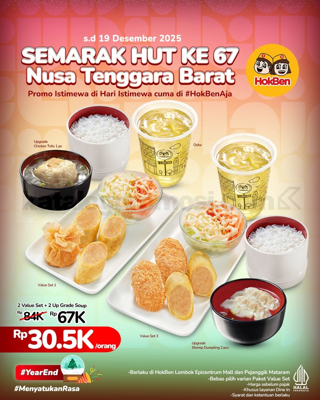 Promo HokBen HUT ke-67 Provinsi NTB Value Set Rp. 67.000 menawarkan paket 2 Value Set plus 2 upgrade soup untuk dine in, berlaku hingga 19 Desember 2025 di outlet tertentu.