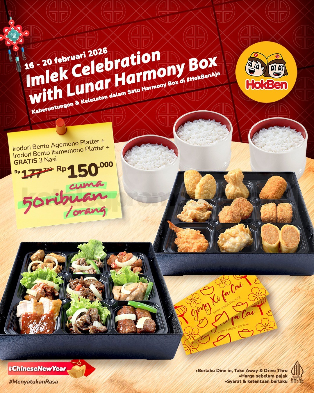 Promo ini cocok untuk kumpul keluarga saat Imlek, berbagi kebahagiaan bersama orang tersayang, atau jadi hantaran spesial yang berkesan 🎊 Periode berlaku 16–20 Februari 2026 dan bisa dinikmati melalui layanan dine in, take away, maupun drive thru di seluruh outlet HokBen.