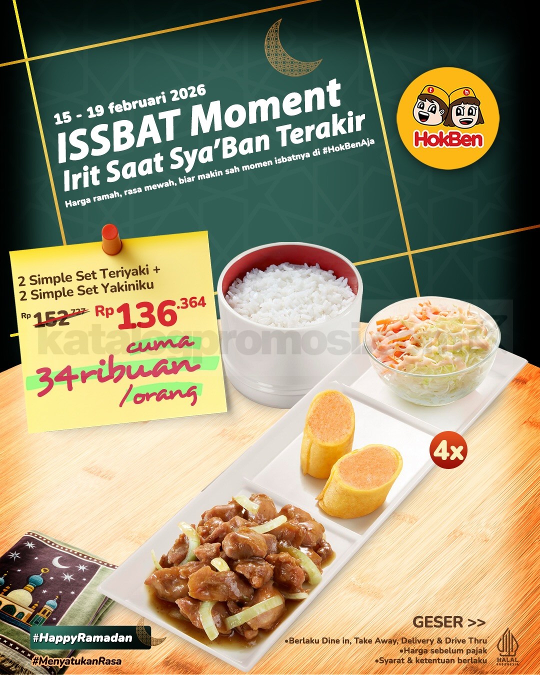 Kamu bisa langsung tentukan mau pilih 4 Hoka Hemat atau kombinasi Simple Set Teriyaki dan Yakiniku. Promo HokBen Issbat Moment Paket Hemat Mulai Rp. 90.910 ini cocok banget buat momen makan bareng sebelum periode berakhir di 19 Februari 2026.