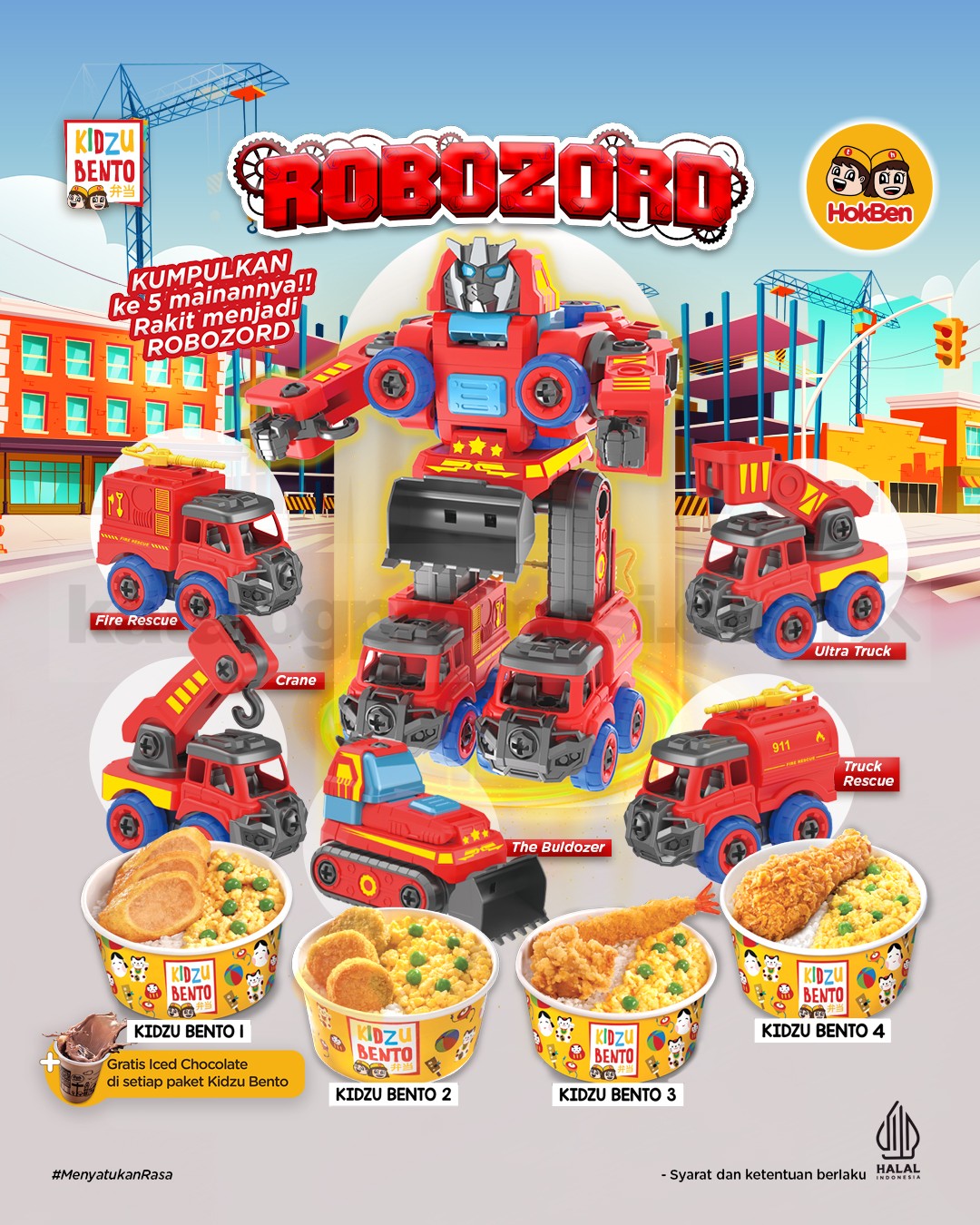 Promo HOKBEN Kidzu Bento gratis mainan Norimono Rafuto yang bisa dirakit jadi kendaraan seru, mulai Rp. 38.000 termasuk Iced Chocolate di seluruh outlet HokBen.