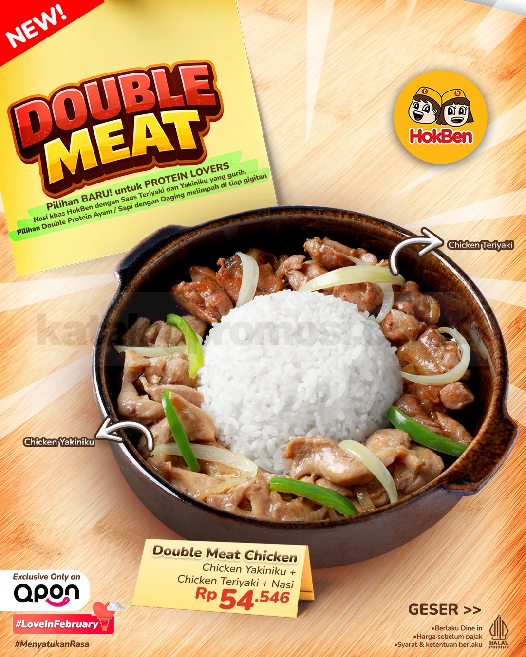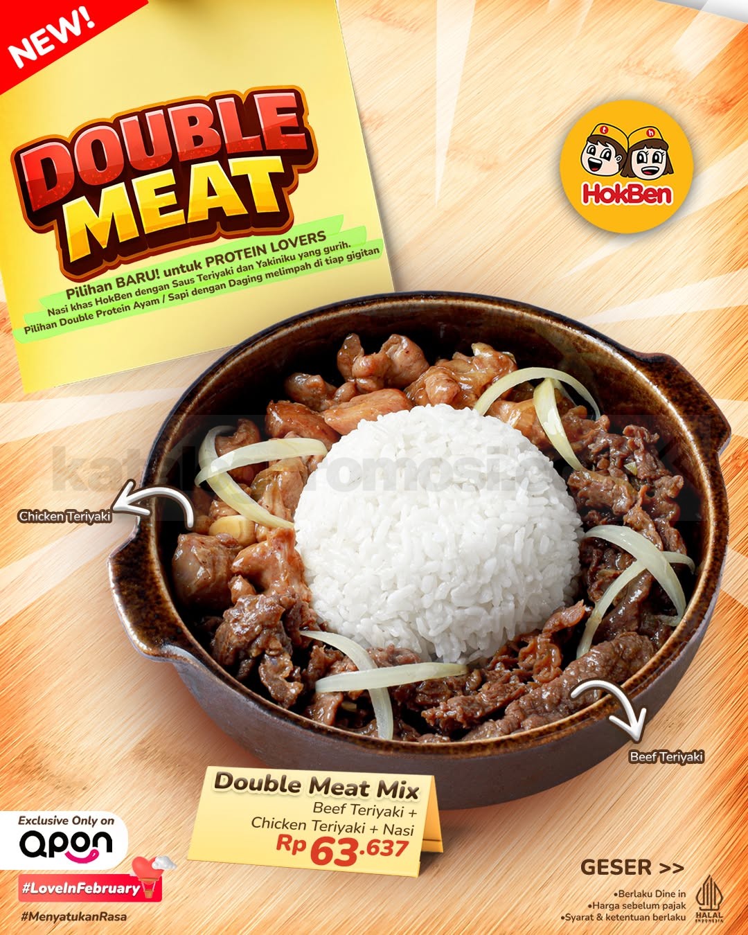 Promo HokBen NEW! Double Meat mulai Rp. 54.546 dengan pilihan Beef, Chicken, atau Mix plus nasi dan saus spesial, berlaku mulai tanggal 12 Februari 2026 di Qpon untuk dine in.