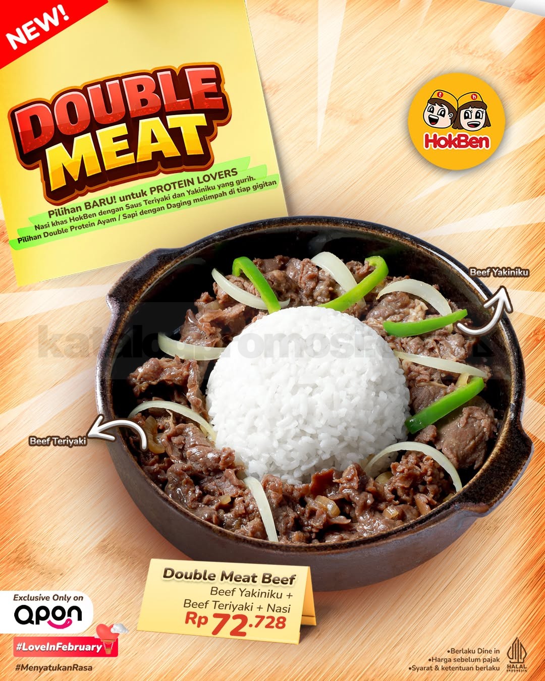 - Double Meat Beef berisi Beef Yakiniku + Beef Teriyaki + nasi dengan harga Rp. 72.728
