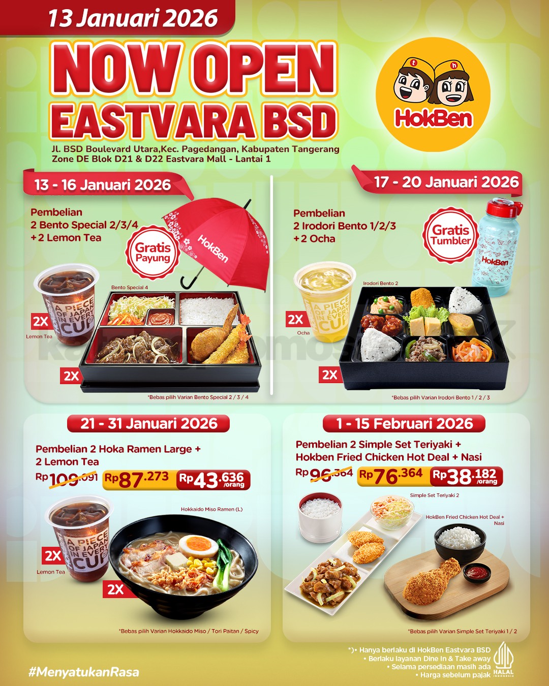 Promo HokBen Opening Eastvara BSD Gratis Payung & Tumbler dengan paket hemat bento dan ramen berlaku mulai tanggal 13 Januari 2026 – 15 Februari 2026 di lokasi tertentu.