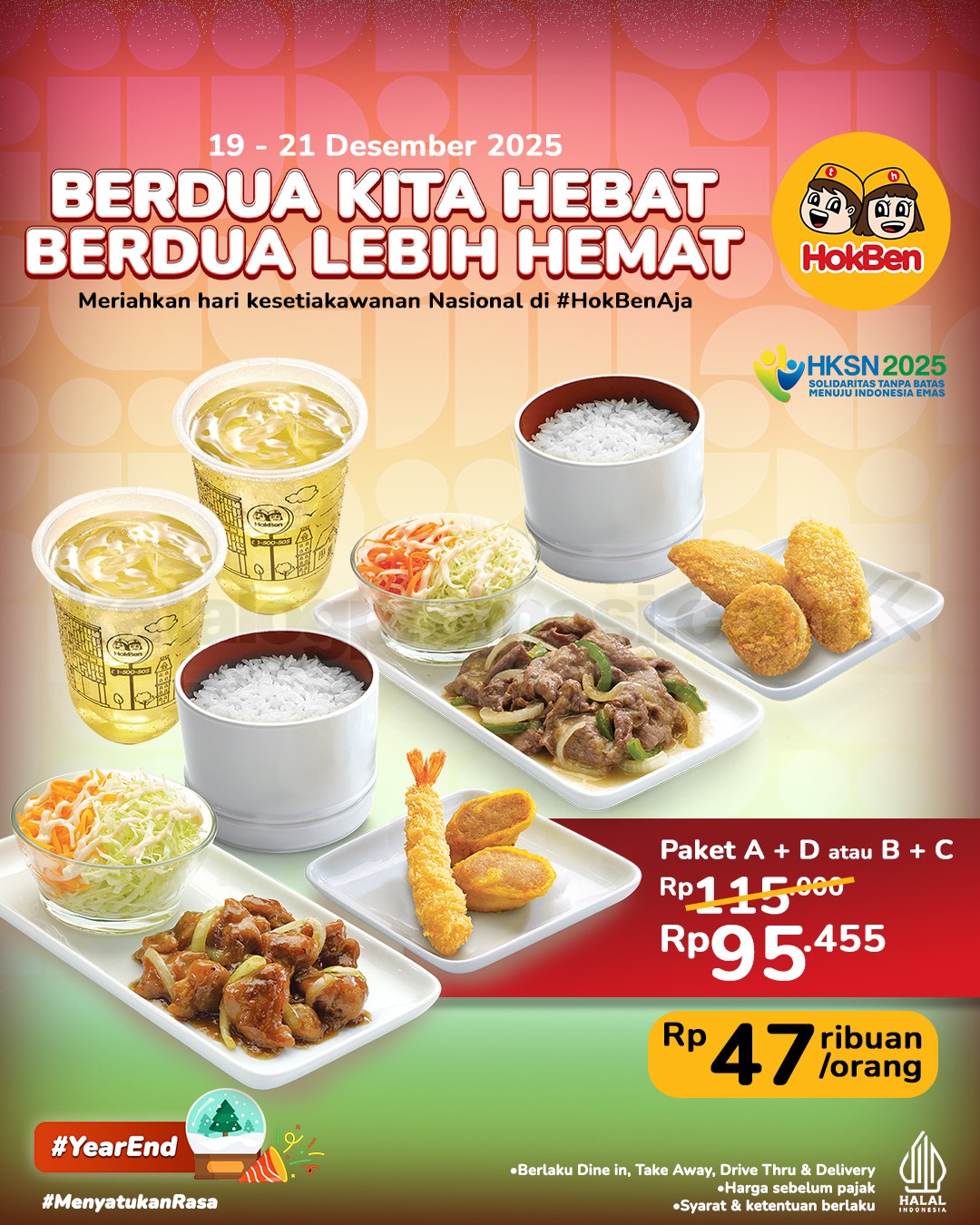 Promo HokBen Paket Berdua Mulai Rp. 47 ribu di hari kesetiakawanan nasional dengan menu lengkap plus 2 Cold Ocha, makan berdua lebih hemat berlaku mulai tanggal 19–21 Desember 2025 di seluruh outlet.