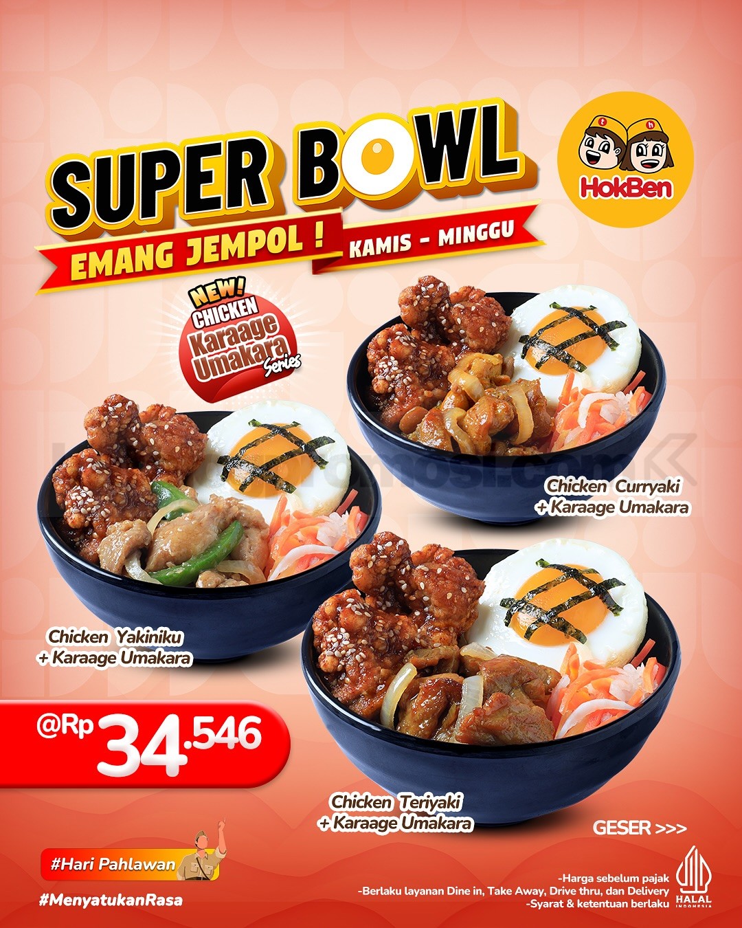 Hari Kamis sampai Minggu jadi lebih seru bareng Super Bowl di HokBen! ๐ฅข Yeay, kamu bisa nikmati menu super lengkap dengan pilihan varian chicken maupun beef yang rasanya juara.
