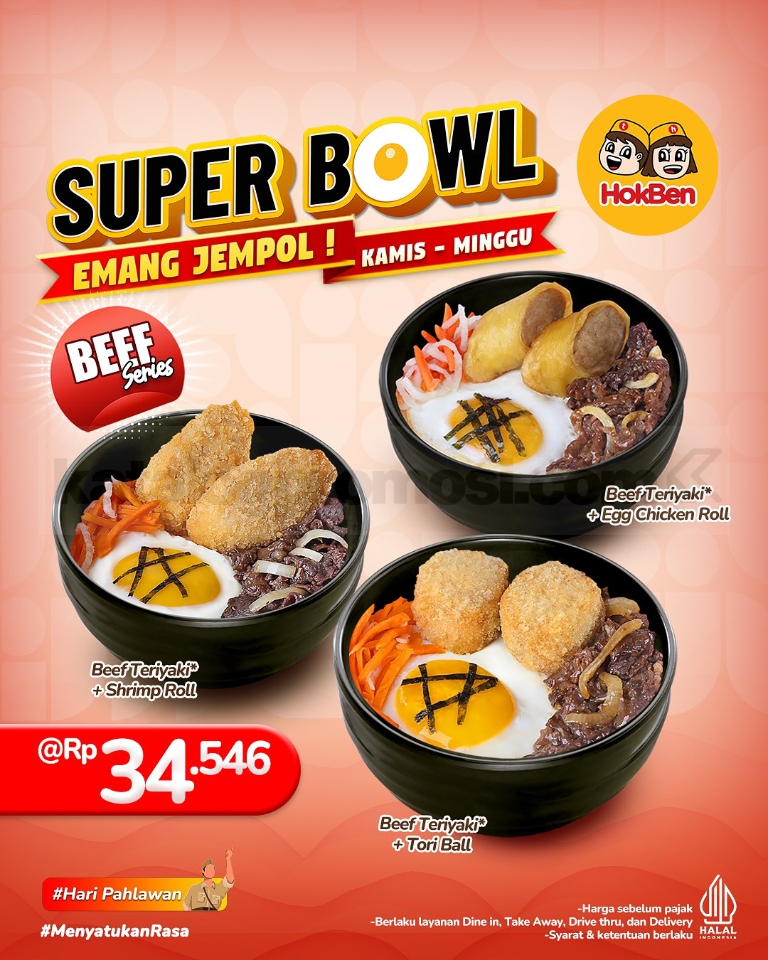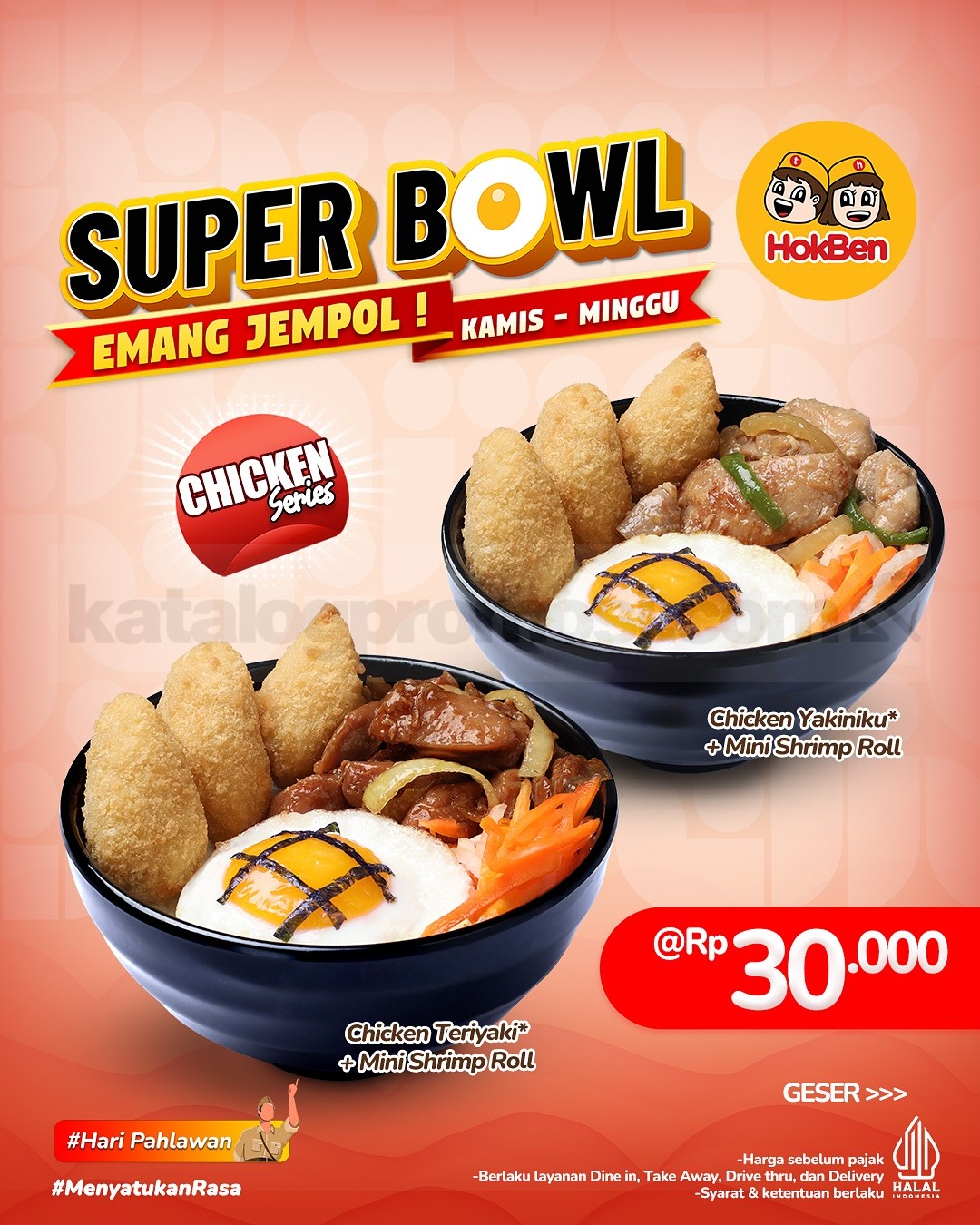 Promo HOKBEN Paket Super Bowl Chicken & Beef mulai 30 ribu berlaku KamisโMinggu di seluruh store, tersedia dine in, take away, delivery, drive thru, dan online order.