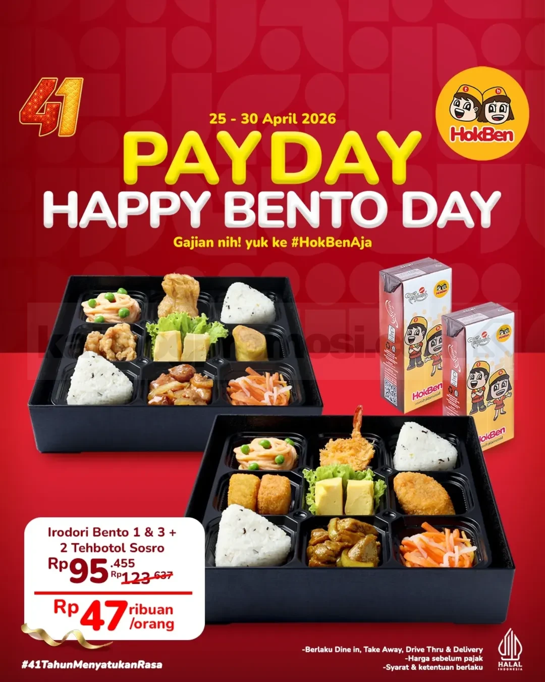 Promo HokBen Payday Happy Bento Day mulai Rp. 47 ribuan periode 25 – 30 April 2026 paket Bento combo tersedia dine in, take away, Drive Thru, dan delivery harga sebelum pajak.