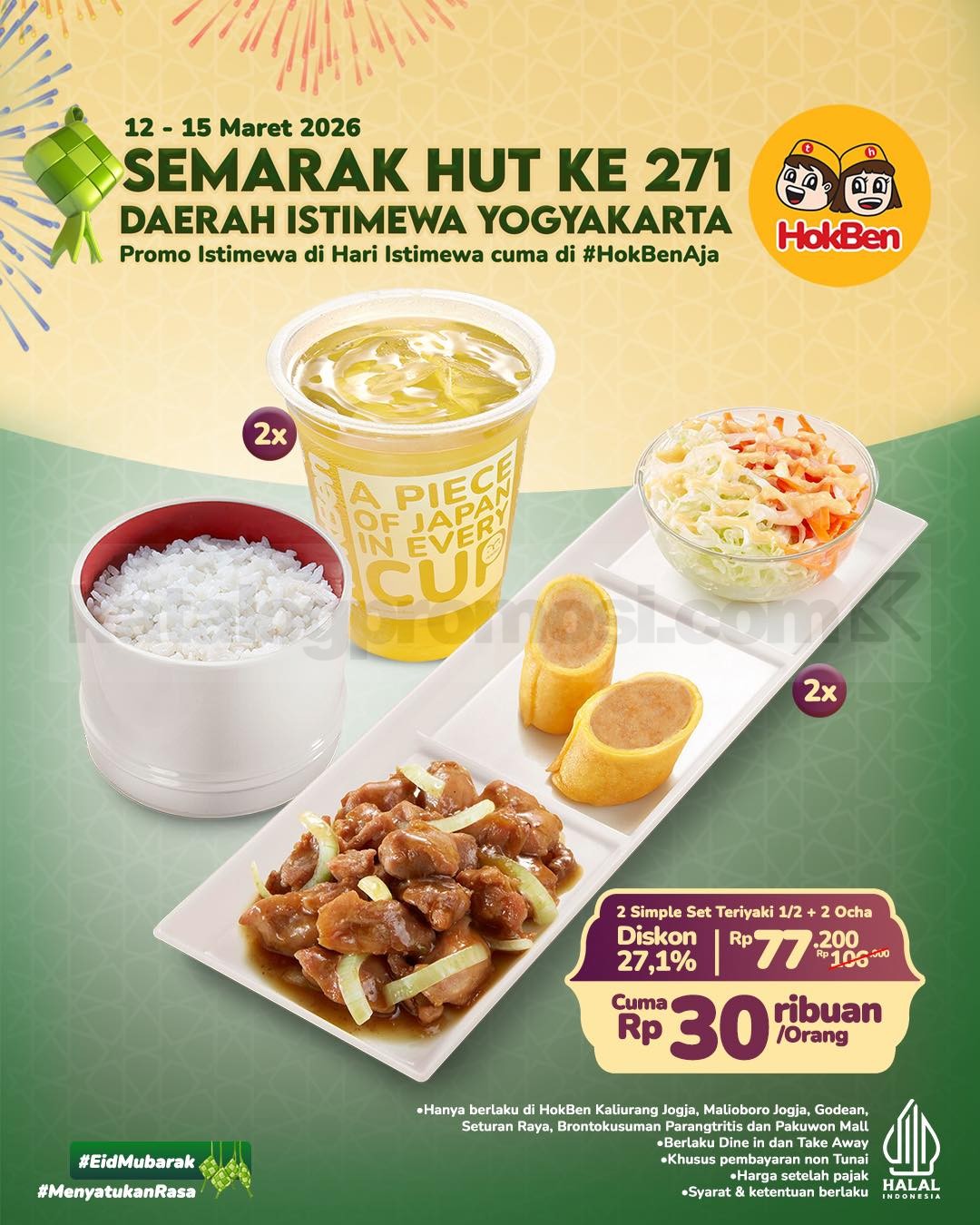 Promo HokBen Semarak HUT DIY Paket Hemat Diskon 27,1% nikmati 2 Simple Set Teriyaki + 2 Ocha berlaku mulai tanggal 12 Maret 2026 – 15 Maret 2026 di HokBen wilayah DI Yogyakarta.