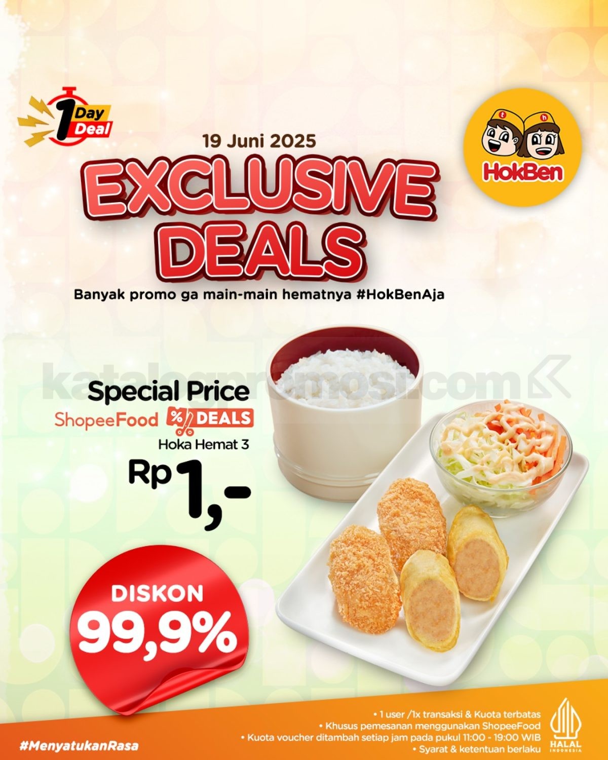 Promo HokBen ShopeeFood Hoka Hemat 3 Cuma Rp1 hanya 19 Juni 2025! Dapatkan diskon 99,9% via voucher Deals ShopeeFood mulai jam 11 siang, kuota terbatas!