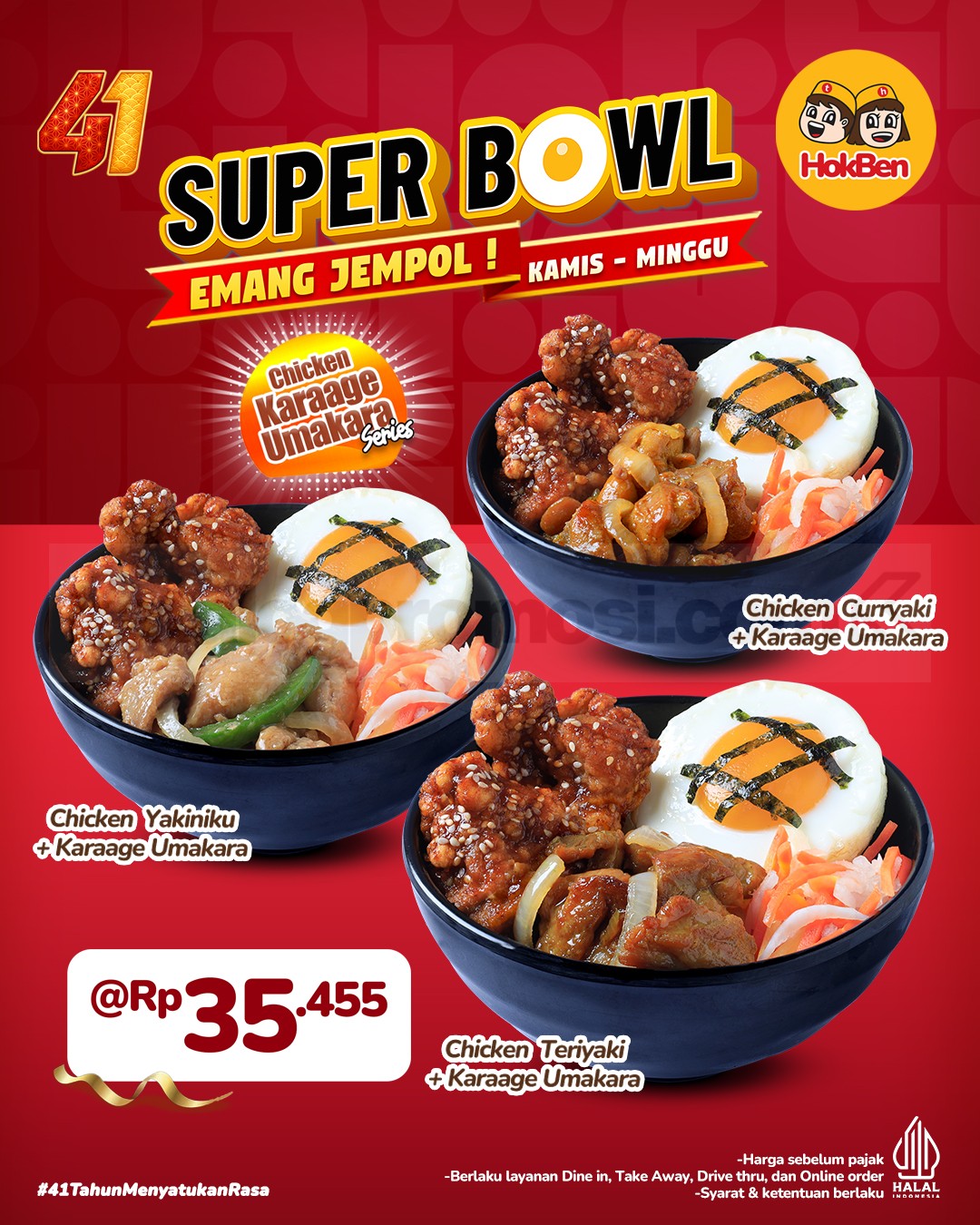 Promo HokBen Super Bowl Rp. 35.455 dengan pilihan menu lengkap chicken dan beef berlaku setiap kamis-minggu selama periode promo di seluruh outlet.
