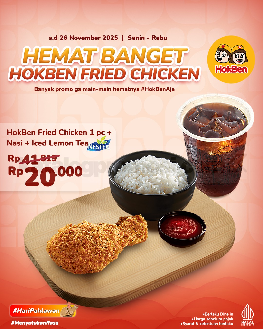 Promo HokBen Super Hemat Fried Chicken Rp.20.000, nikmati 1 Fried Chicken + Nasi + Lemon Tea via Dine In, berlaku mulai Senin – Rabu s.d 26 November 2025.