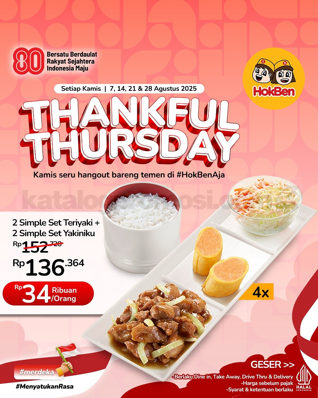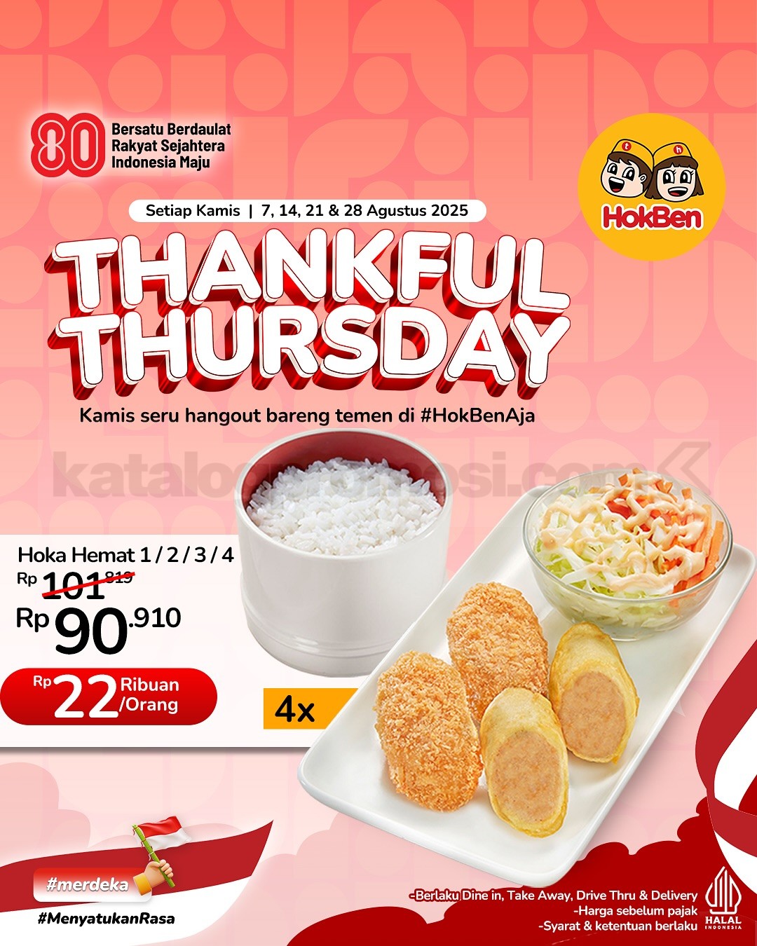 Promo HokBen Thankful Thursday! Paket Hemat mulai Rp22 ribuan/orang. berlaku setiap hari Kamis pada tanggal 7, 14, 21, dan 28 Agustus 2025