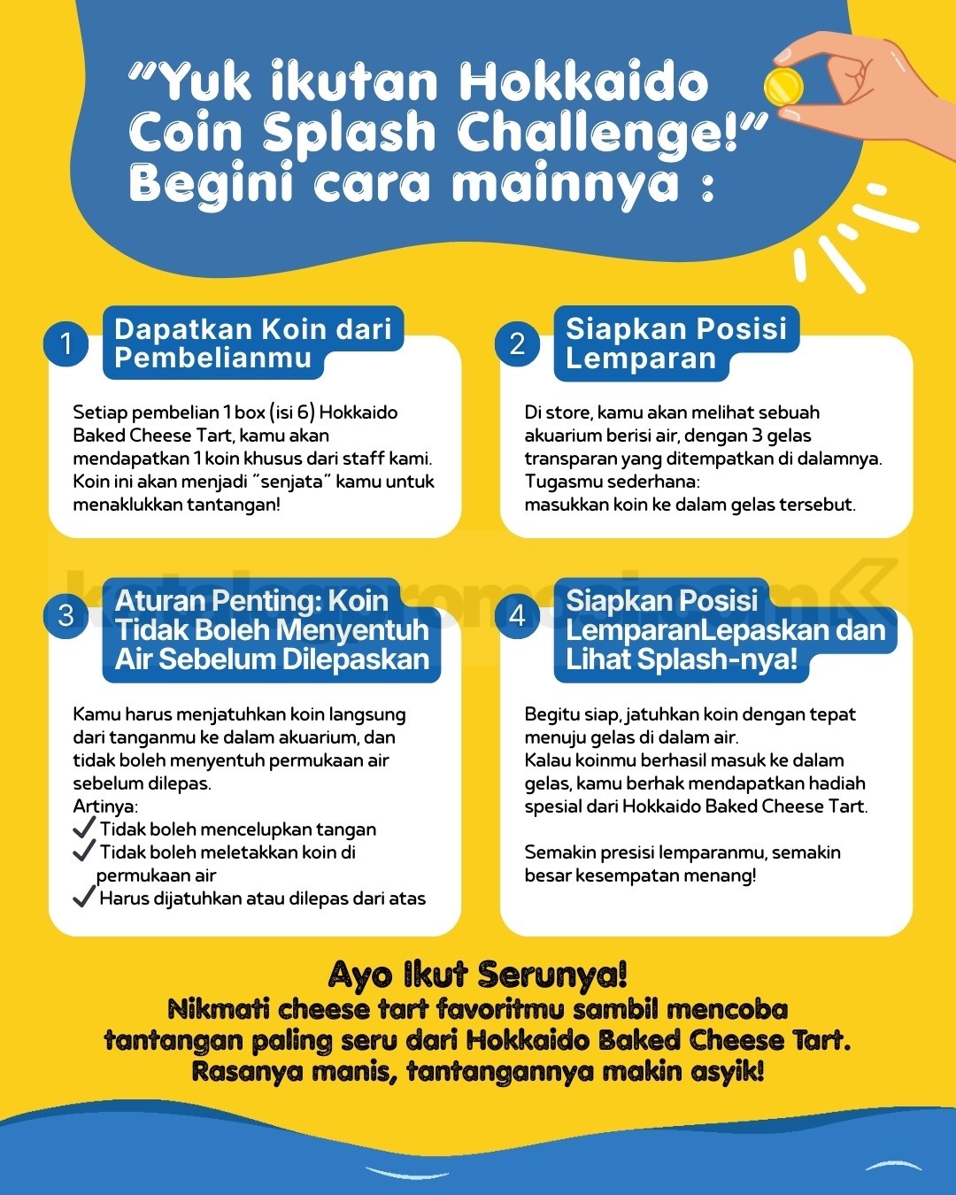 Promo Hokkaido Anniversary Gratis 1 Box Cheese Tart kembali membawa keseruan untuk para pecinta dessert! Kali ini, kamu bisa menikmati tantangan Hokkaido Coin Splash Challenge sambil mencicipi cheese tart favoritmu.