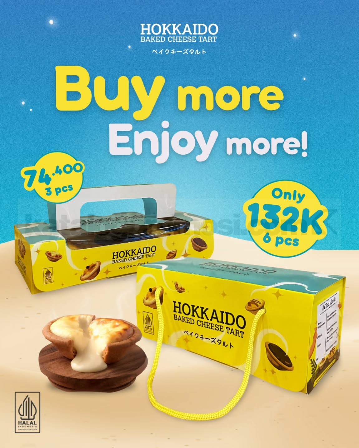 Melalui promo Buy More Enjoy More, Hokkaido Baked Cheese Tart menawarkan dua pilihan box yang bisa disesuaikan dengan kebutuhan. Dengan harga Rp.74.400 kamu bisa membawa pulang box isi 3 pcs, sementara box isi 6 pcs dibanderol Rp.132.000 yang membuat harga per pcs terasa jauh lebih ringan. Tekstur pastry tetap renyah, isi keju tetap creamy, dan rasanya konsisten di setiap gigitan.