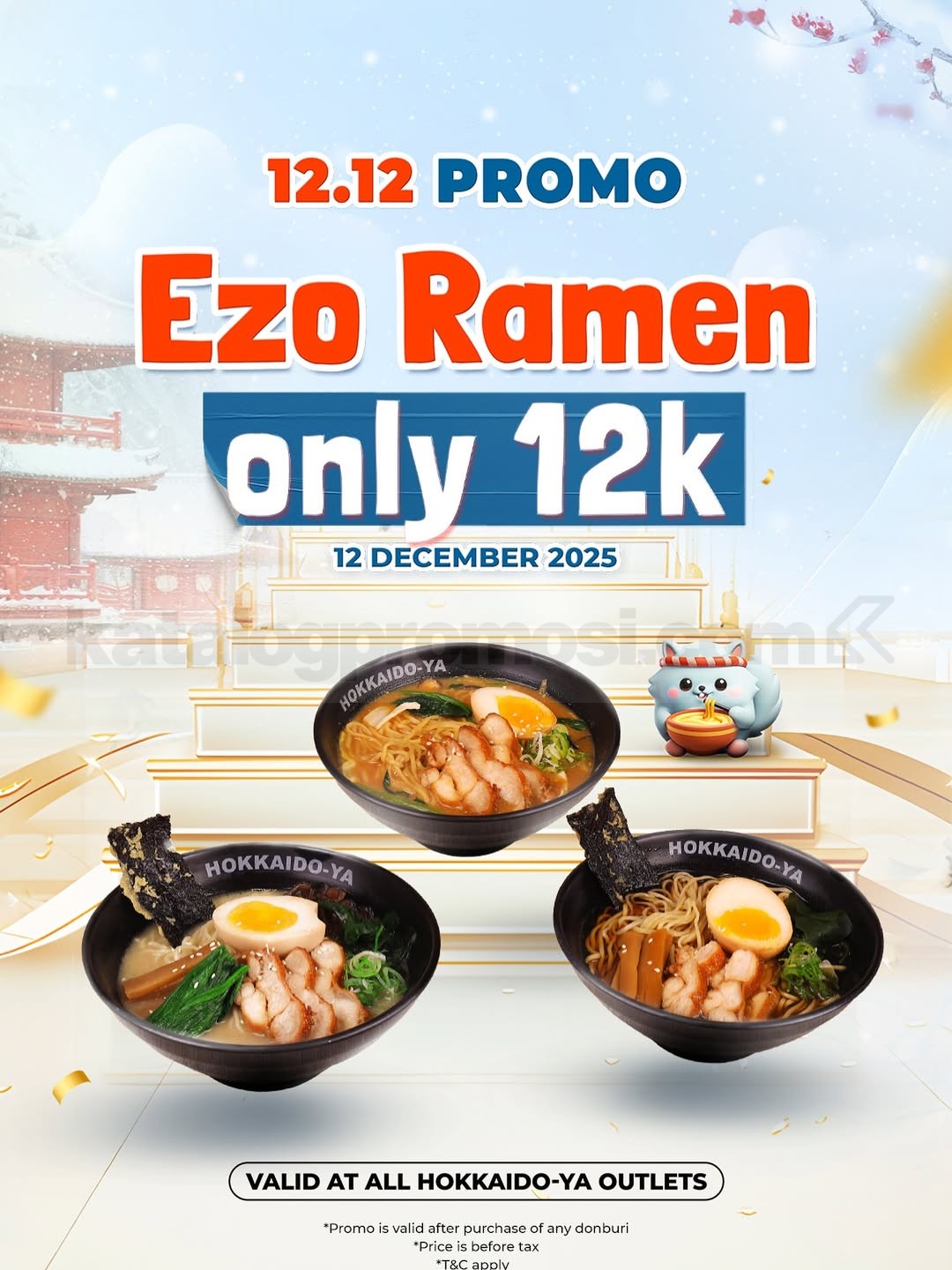 Promo Hokkaido-Ya 12.12 Ezo Meal Ramen Rp. 12.000 dengan beli 1 Donburi untuk add-on ramen, berlaku 12 Desember 2025 dine-in di seluruh outlet.