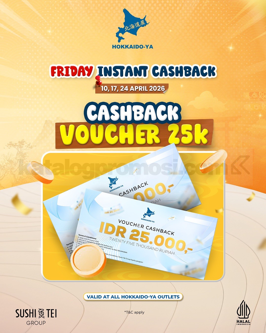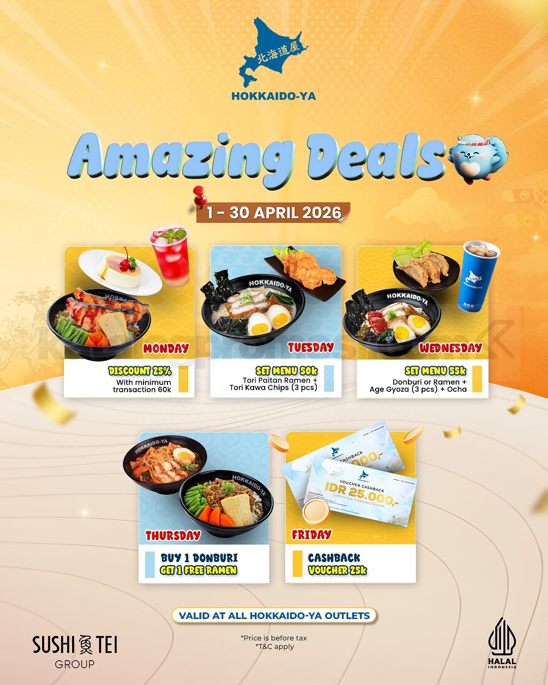 Promo Hokkaido-Ya Amazing Deals diskon hingga 25% dengan menu spesial harian berlaku mulai tanggal 1 April 2026 – 30 April 2026 di seluruh outlet.