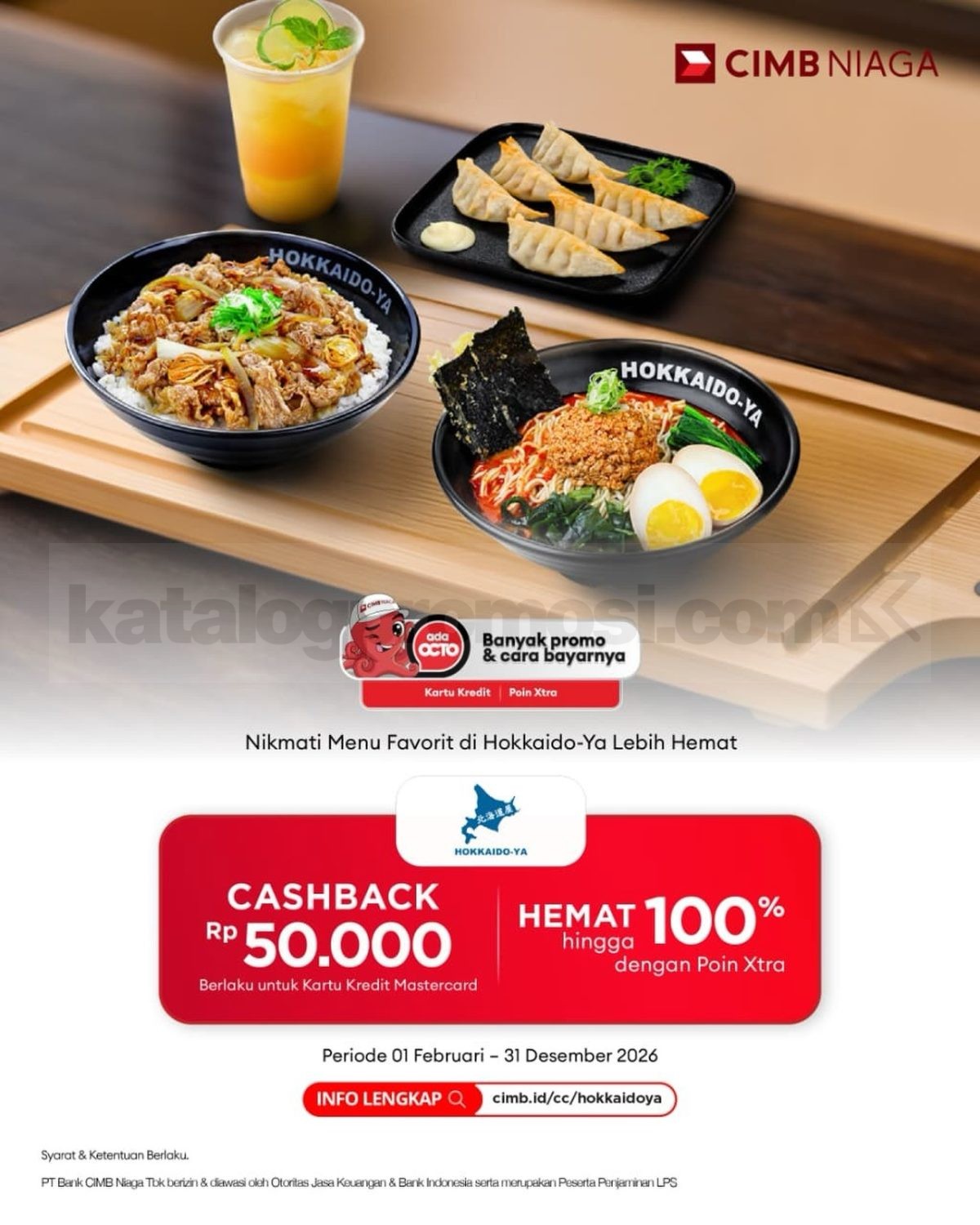 Promo Hokkaido-Ya CIMB Niaga Mastercard cashback Rp. 50.000 dengan Poin Xtra hingga 100%, bayar pakai kartu kredit, berlaku mulai 1 Februari 2026 – 31 Desember 2026 di seluruh outlet.