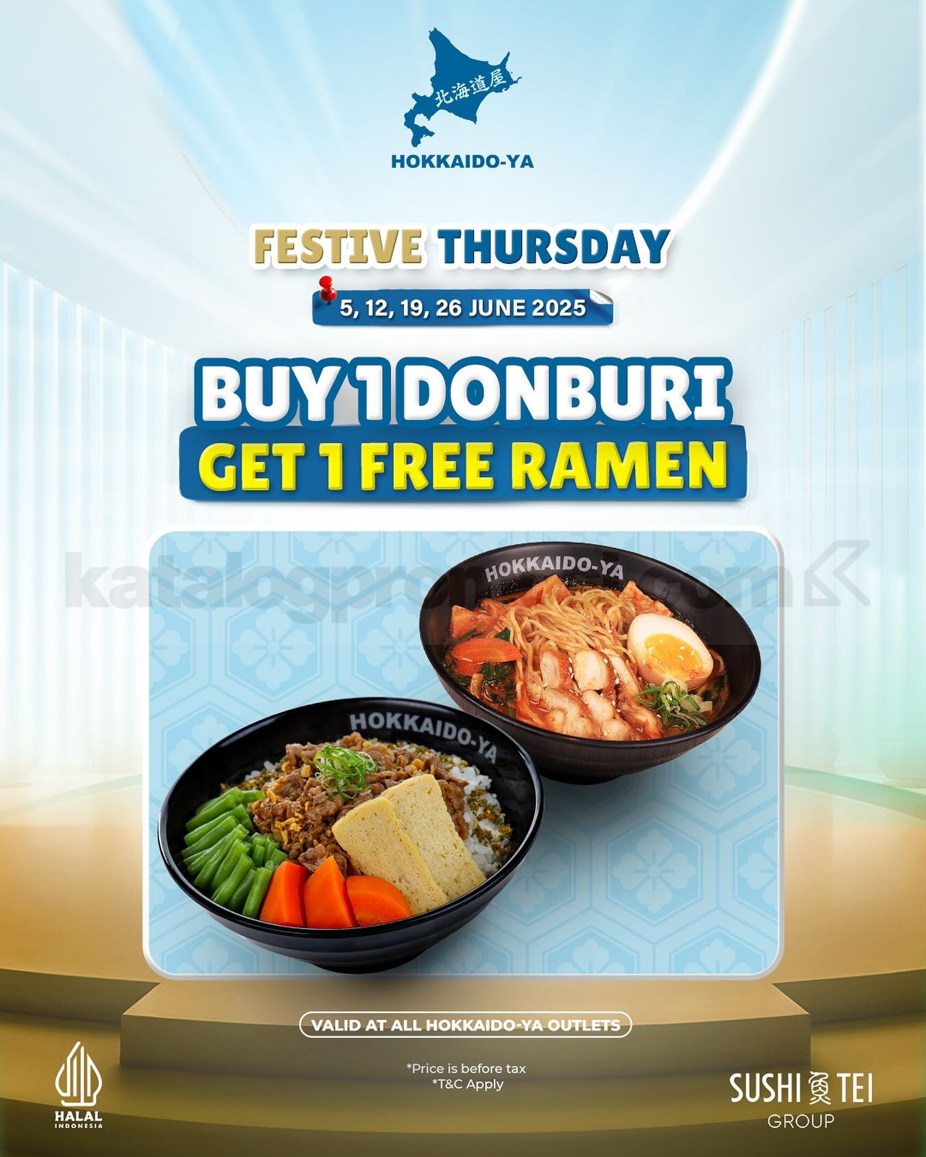 Bikin Kamis lebih spesial dengan promo Hokkaido-Ya Buy 1 Donburi Get 1 Free Ramen. Ajak teman, keluarga, dan nikmati pengalaman makan yang hemat sekaligus puas! 🍜🎉