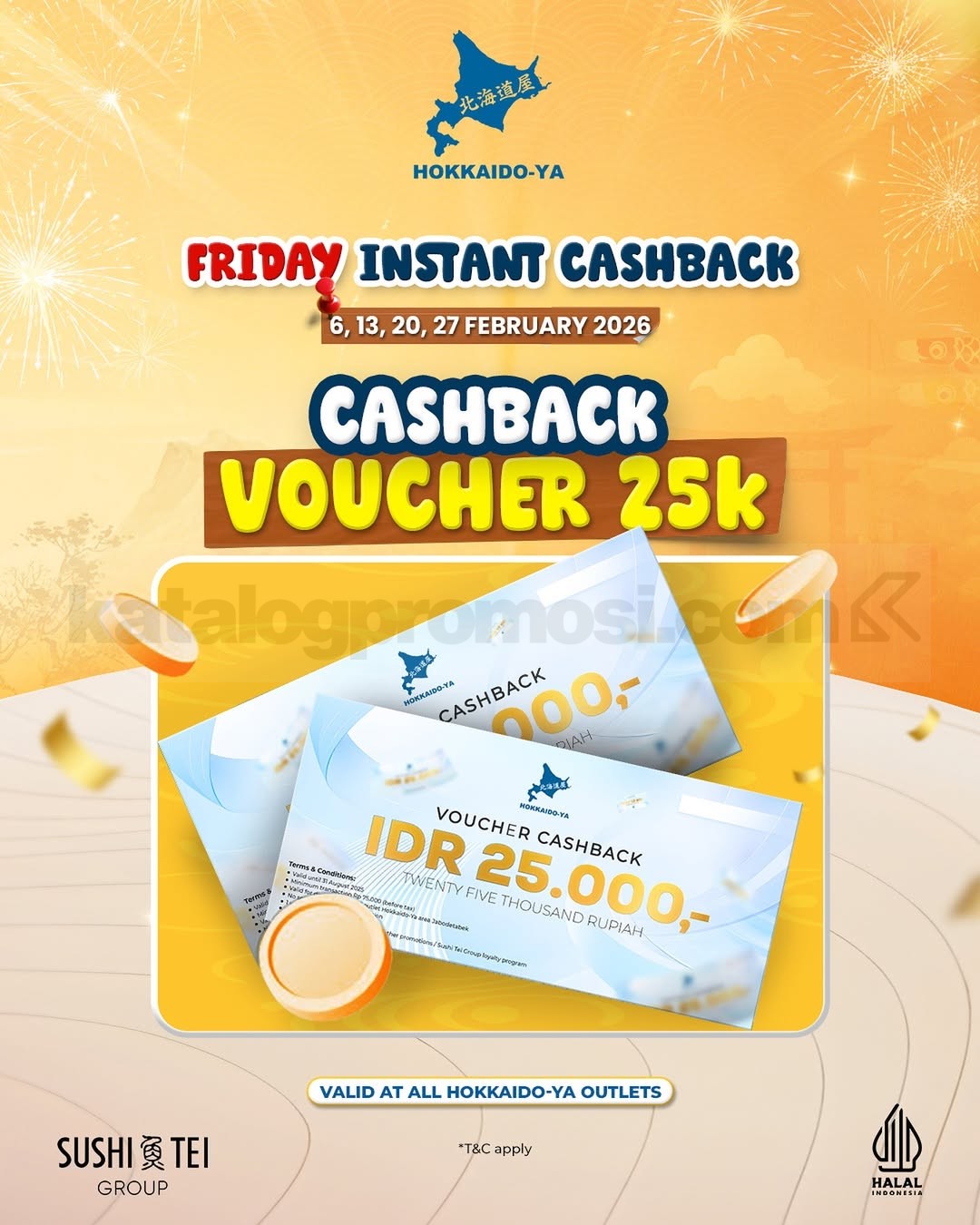 Selama tanggal 6, 13, 20, dan 27 Februari 2026, setiap transaksi minimal Rp75.000 sebelum pajak akan mendapatkan instant cashback Rp. 25.000. Promo ini berlaku di seluruh outlet Hokkaido-Ya, sehingga pelanggan bisa menikmati menu favorit sambil merasakan keuntungan tambahan setiap Jumat.