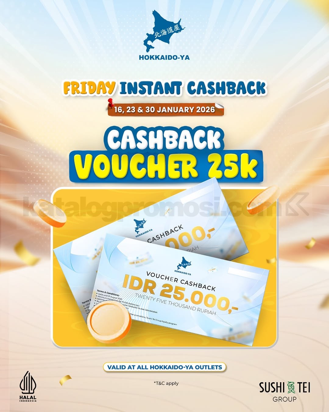 Promo Hokkaido-Ya Friday Instant Cashback Rp25.000, dapat voucher cashback setiap transaksi, berlaku mulai tanggal 16 Januari 2026 – 30 Januari 2026 di seluruh outlet.