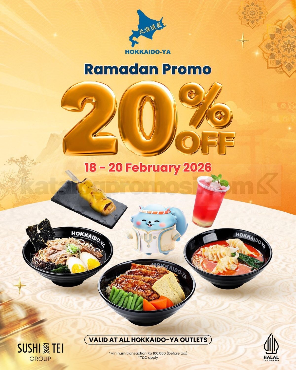 Promo Hokkaido-Ya Ramadan Disc 20% Off menu favorit diskon hingga Rp. 50.000 min. transaksi berlaku mulai tanggal 18 Februari 2026 – 20 Februari 2026 dine-in