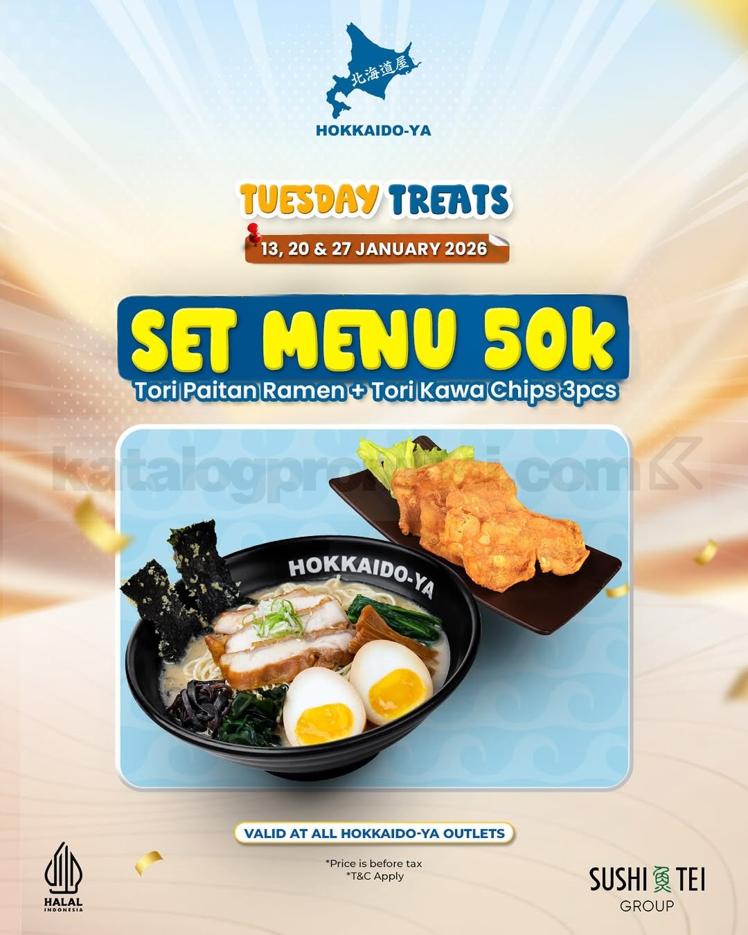 Promo Hokkaido-Ya Tuesday Treats Set Menu Rp. 50.000 nikmati Tori Paitan Ramen dan Tori Kawa Chips, dine-in, berlaku mulai tanggal 13 Januari 2026 – 27 Januari 2026 di seluruh outlet