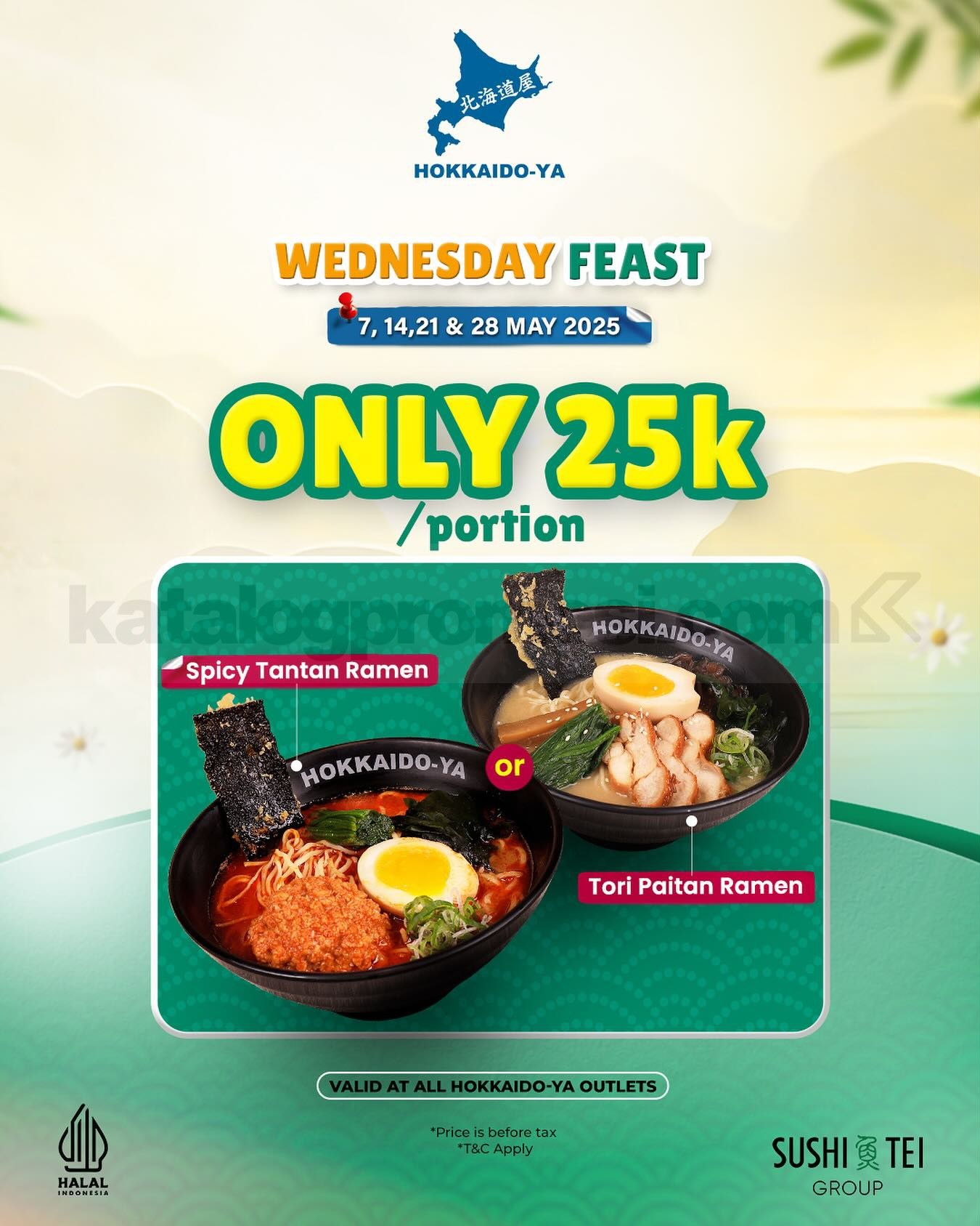 Promo Hokkaido-Ya Wednesday Feast Set Menu cuma Rp. 50.000, paket Donburi/Ramen + Age Gyoza 3 pcs + Ocha segar, berlaku 5,12,19,26 November 2025 di outlet pilihan.