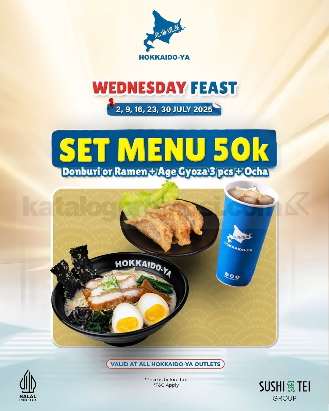 Promo Hokkaido-Ya Wednesday Feast Set Menu cuma Rp. 50.000, paket Donburi/Ramen + Age Gyoza 3 pcs + Ocha segar, berlaku 5,12,19,26 November 2025 di outlet pilihan.