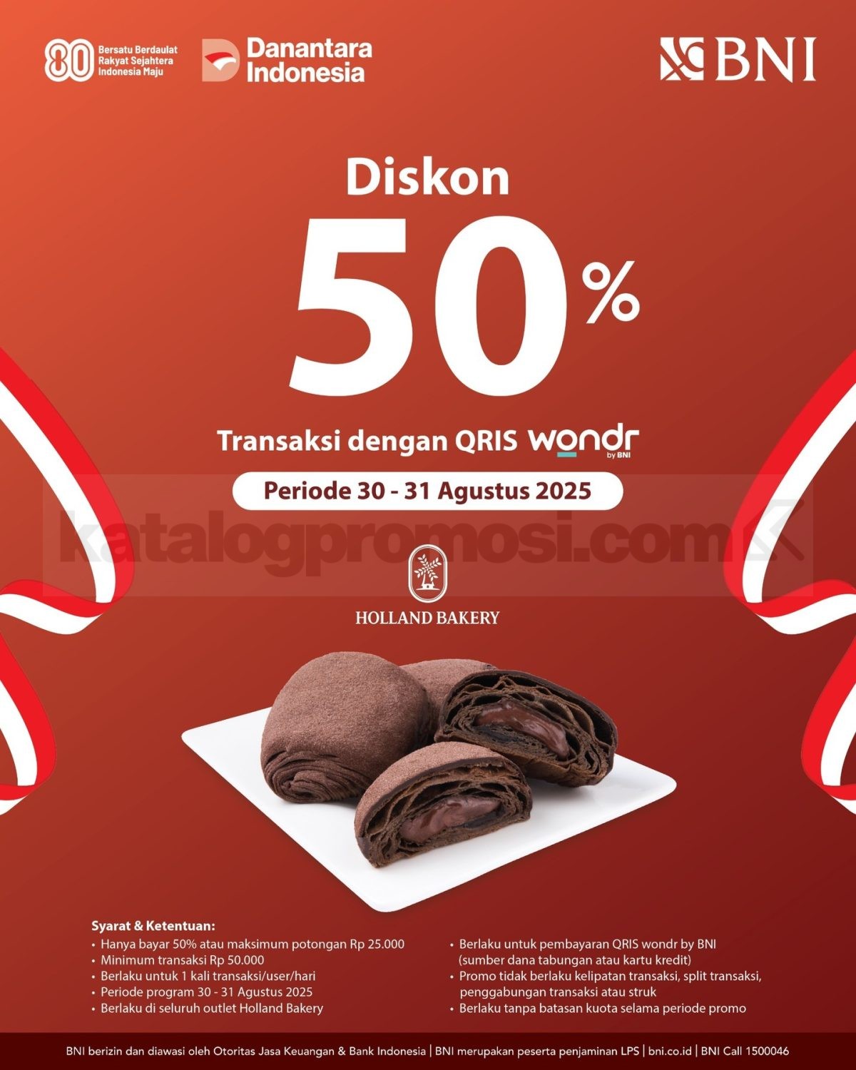 Promo Holland Bakery diskon 50% dengan QRIS Wondr by BNI berlaku 30β31 Agustus 2025 di seluruh outlet, minimum transaksi Rp50.000.