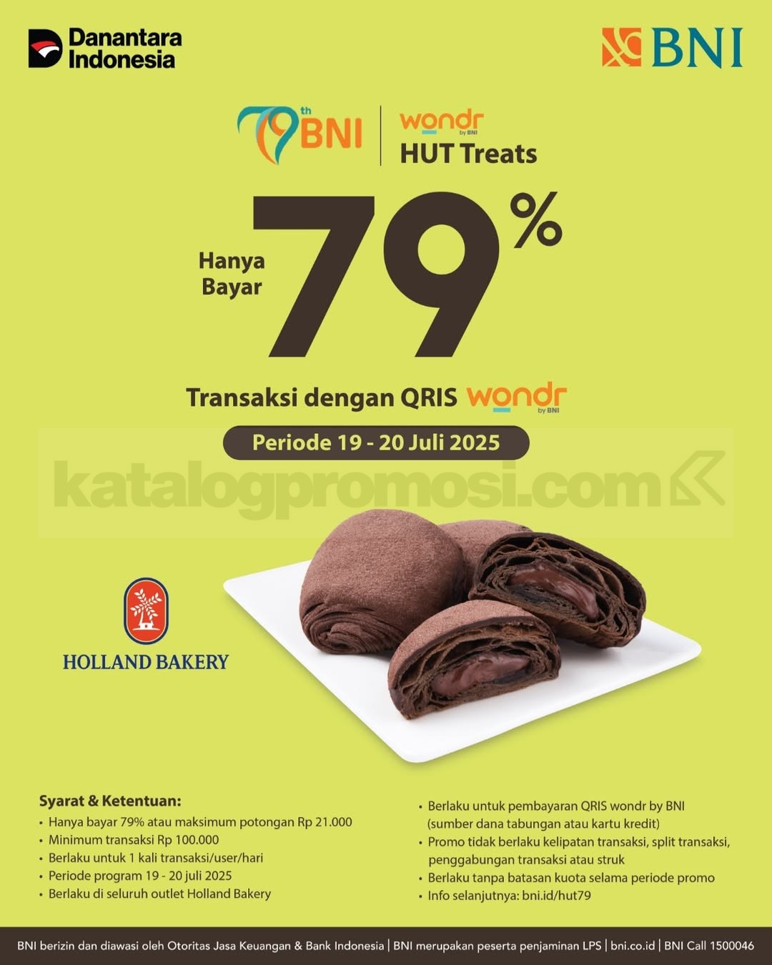 Promo Holland Bakery diskon 50% dengan QRIS Wondr by BNI berlaku 30–31 Agustus 2025 di seluruh outlet, minimum transaksi Rp50.000.