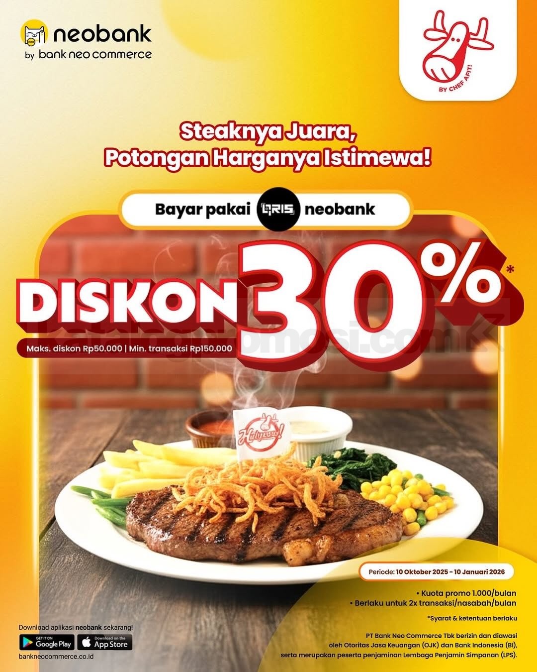 Buat penikmat steak yang ingin hemat tanpa ribet, promo ini cukup menguntungkan. Kamu tinggal pilih menu steak favorit, lakukan pembayaran pakai QRIS dari bank neo commerce, dan diskonnya langsung diterapkan. Tidak perlu kode atau minimal belanja, cukup pastikan kuota bulanan belum habis saat kamu bertransaksi.