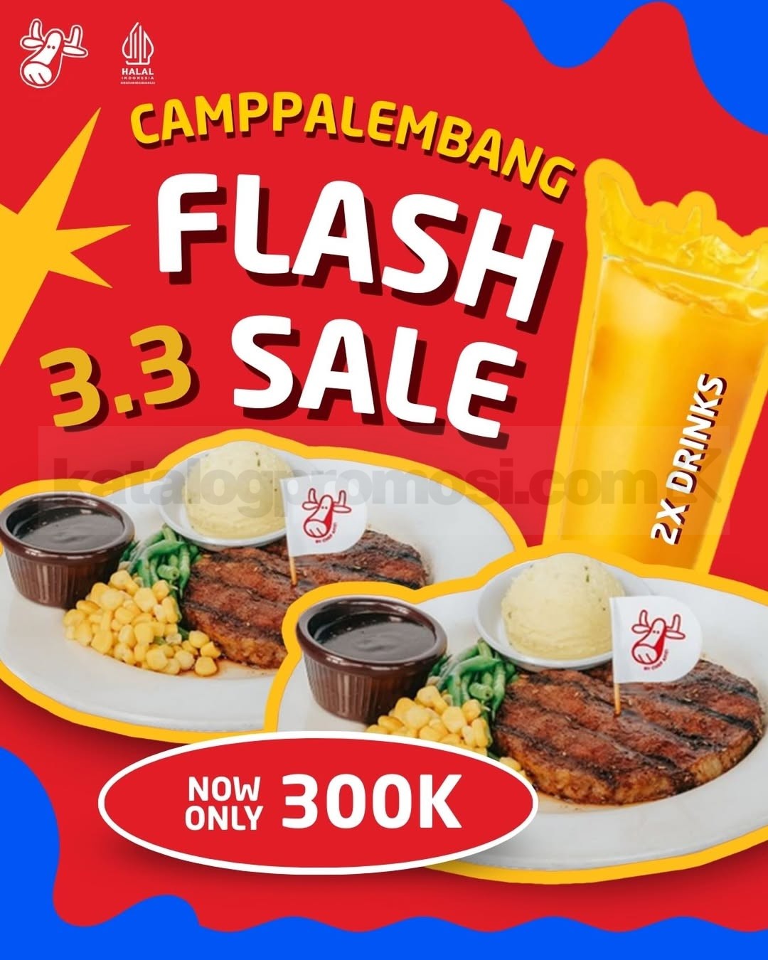 Promo Holycow Flash Sale 3.3 Paket Berdua Rp. 300ribu nikmati 2 steak, side dish, dan 2 minuman berlaku selama persediaan masih ada di Holycow Camp Palembang