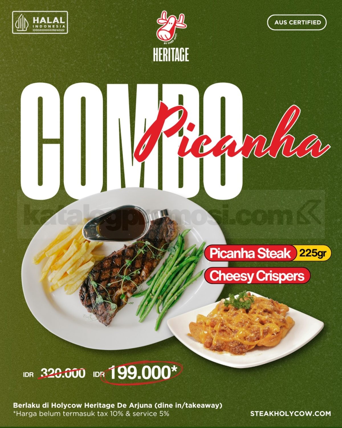 Promo Holycow Heritage Combo Picanha Steak Rp. 199.000 nikmati picanha 225gr + cheesy crispers berlaku selama persediaan masih ada di Holycow Heritage De Arjuna.