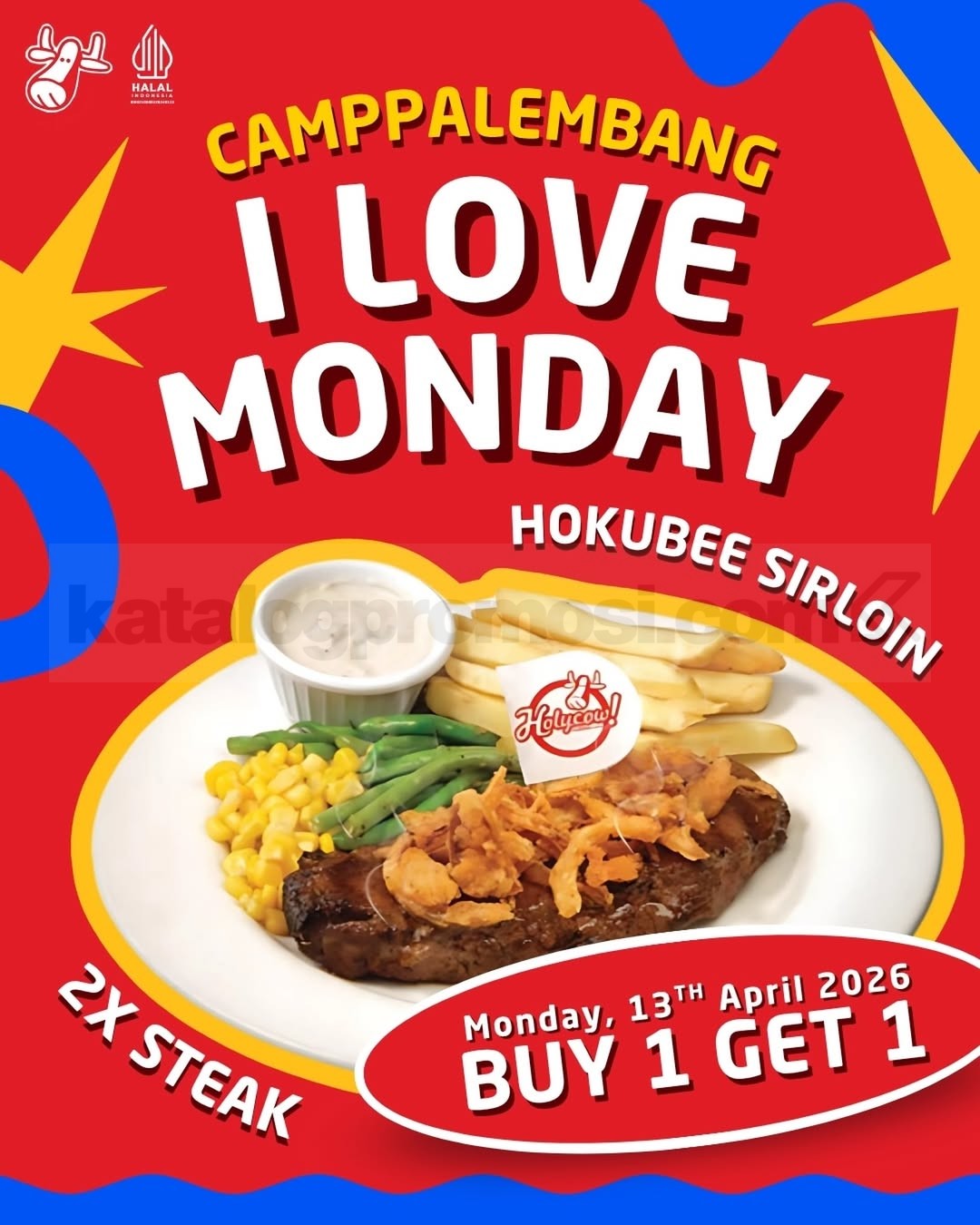 Promo Holycow I Love Monday Buy 1 Get 1 Steak Hokubee Sirloin porsi dobel berlaku mulai tanggal 13 April 2026 di Holycow Camp Palembang